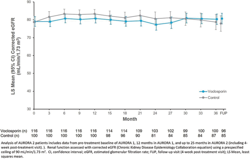 Conclusion: Voclosporin was well-tolerated over 3 years of treatment with no unexpected safety signals detected. Further, eGFR remained stable throughout the study period, and the significant and meaningful reductions in proteinuria achieved in AURORA 1 were maintained. These data provide evidence of a long-term treatment benefit of VCS in patients with LN.