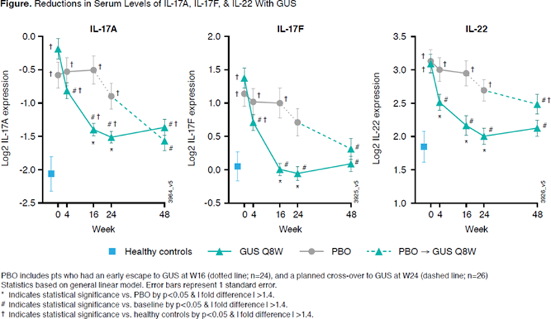 Conclusion: GUS-tx TNFi-IR pts showed response-specific associations with BL biomarkers (IL-22, IFNɣ, IL-6, and SAA). GUS resulted in decreased levels of elevated CRP, SAA, IL-6, IL-17A, IL-17F, and IL-22, while no significant change was observed with PBO tx. Reductions in these biomarkers were evident as early as W4 and approximated levels seen in HC from W16 onward (W4 for IL-22), suggesting apparent normalization of effector cytokines associated with the IL-23/Th17 axis following GUS tx.