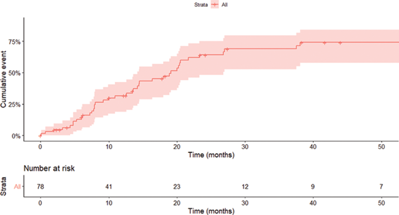 Patients were treated during the preconceptional period with NSAIDs, corticosteroids, csDMARDs and biotherapy in 10 (12.8%), 35 (44.9%), 24 (30.8%), and 32 (41.0%) cases, respectively. The multivariate model adjusted for age, BMI, DAS28-CRP, disease duration, ACPA positivity, and exposure to corticosteroids and biologics in the preconception period found an association between increased preconception delay and age (HR (per year) 1. 12 95% CI [1.04-1.16] p = 0.01) as well as disease duration (HR (per year) 1.06 95% CI [1.02-1.15] p = 0.03).