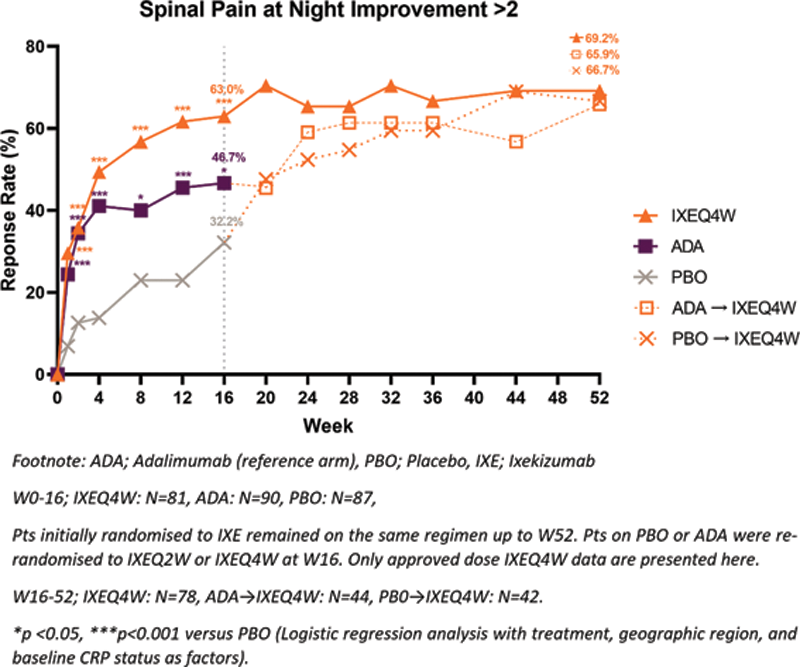 Results: A greater proportion of patients achieved >2 improvement in SP-N with IXE treatment compared to PBO at W16 (63.0% vs. 32.2%, p <0.001) and improvement was sustained up to W52 (