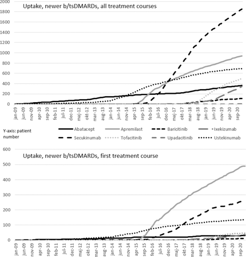 Results: Overall, 13,364 unique patients contributing 24,325 treatment courses with either a newer b/tsDMARD (4,855, 20%) or a TNFi (19,470, 80%, whereof 10,897 were started year 2015-20) were identified. For the sub-group of 11,892 first b/tsDMARD treatment courses, 1,009 (8%) were a newer b/tsDMARD (10,883 were a TNFi, whereof 5,956 were started year 2015-20).