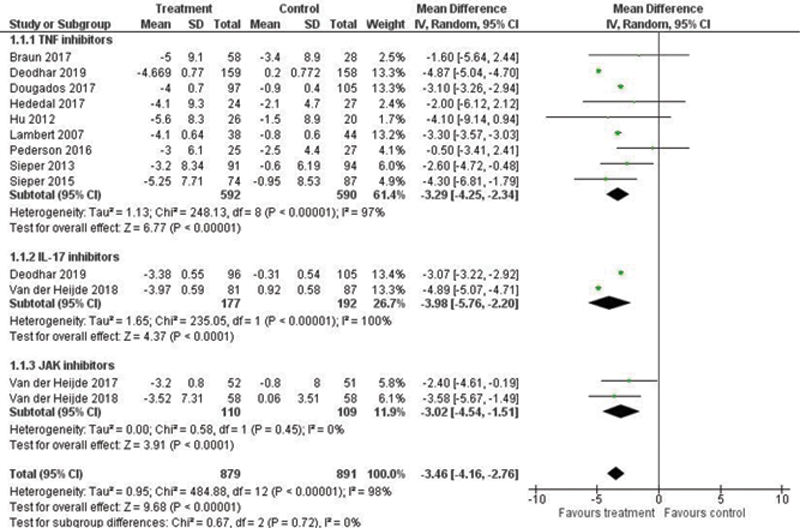 Results: Fifteen studies were included in the meta-analysis. Nine studies evaluated the effect of TNF inhibitors (TNFi), two for ixekizumab, one for filgotinib and one for tofacitinib. At 12 and 16 weeks, SIJ SPARCC score was significantly improved by TNFi (WMD: - 3.29 [95% CI -4.25; -2, 34]), IL-17 inhibitors (WMD: - 3.98 [95% CI –5.76; -2.20]) and by JAK inhibitors (JAKi) (WMD: - 3.02 [95% CI -4.54; -1.51]). There was no difference between the molecule subgroups. At 48-52 weeks, TNFα inhibitors, introduced at baseline, reduced more SIJ SPARCC, but not significantly (WMD: -2.26 [95% CI -4.94; 0.42]), than placebo groups who began a TNFi treatment with delay.