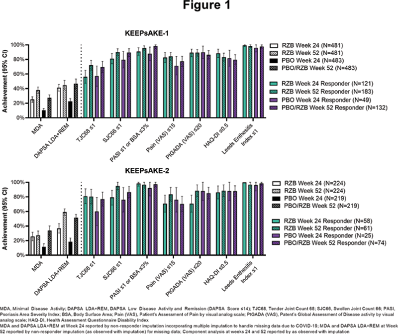 Results: MDA achievement at Week 52 in KEEPsAKE-1 was 37.9% for patients originally randomized to RZB and 27.4% for patients originally randomized to PBO. In KEEPsAKE-2, MDA achievement was 27.2% and 33.8% for patients originally randomized to RZB and PBO, respectively. Achievement of MDA and its components are presented in
