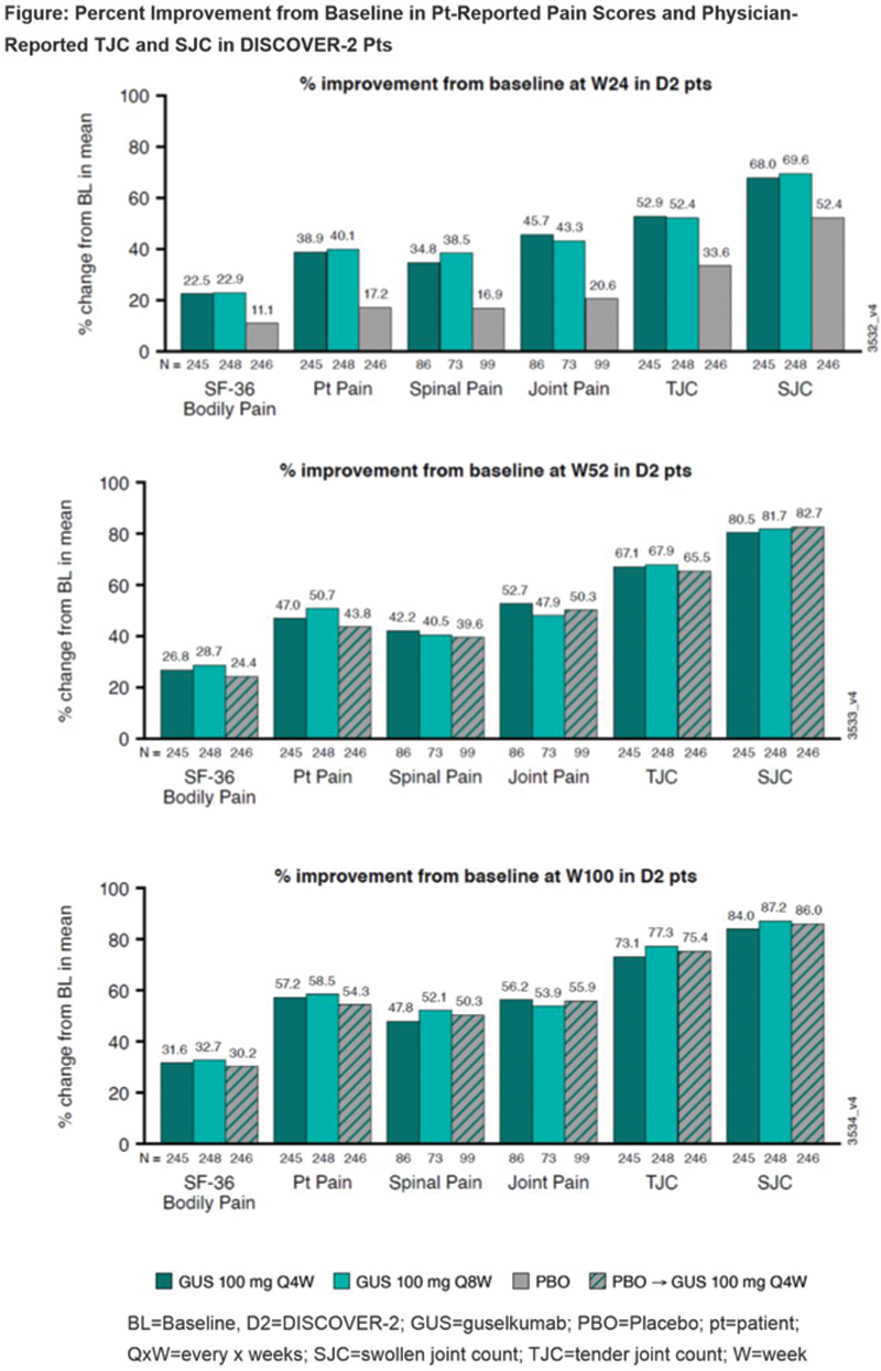 Results: In D2, mean BL for Bodily Pain (range: 4.4-4.5), Pt Pain (6.2-6.3), Spinal Pain (6.5-6.7), Joint Pain (6.3-6.8), SJC (11.7-12.9) and TJC (19.8-22.4) indicated moderate pain and disease activity at study outset. GUS-treated pts reported ~2x improvement in Pt Pain, Spinal Pain, Joint Pain, and Bodily Pain intensity at W24 vs PBO, which were maintained or increased at W52 and W100. PBO→Q4W pts had similar improvements. Pt-reported pain appeared more sensitive to treatment effect, with larger differences in % improvement vs PBO than physician-reported TJC/SJC at W24. D1 showed consistent results through 1 year. In 748 GUS-treated pts across D1&2, substantial proportions achieved meaningful improvement in Pt Pain at early time points: 32% (W4) and 48% (W8) achieved ≥20% improvement; 28% (W12) and 33% (W16) achieved ≥50% improvement. At W24, 63%/39% reported ≥20%/≥50% improvement in pain.