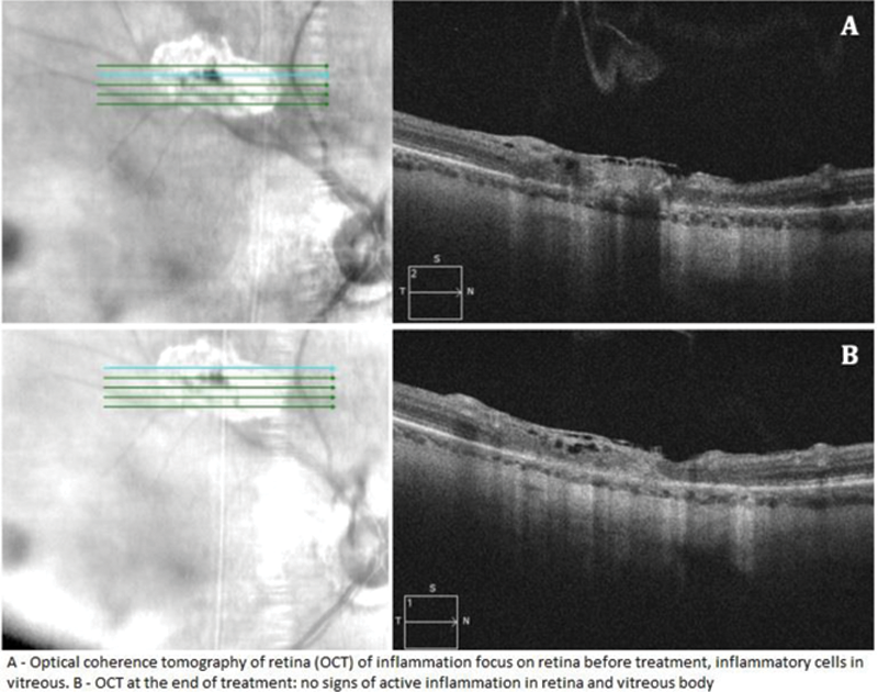 Results: A 59-year-old woman was admitted to the rheumatology department with symmetric arthritis of the hand joints, long morning stiffness duration (up to 4 hours). The diagnosis of rheumatoid arthritis was previously verified according to the ACR / EULAR 2010 criteria (three years ago). She received treatment in accordance with the clinical guidelines of the Ministry of Health of the Russian Federation: methotrexate 12.5 mg per week with a subsequent increase in dosage to 20 mg per week. Due to the increase in transaminases, the dosage of methotrexate was reduced to 17.5 mg per week, the daily intake of glucocorticosteroids (prednisone 7.5 mg per day). Nevertheless she had high disease activity (Disease Activity Score (DAS28) 5.54, Clinical Disease Activity Index (CDAI) 26.6, Simplied Disease Activity Index (SDAI) 30.12). Considering the continued high activity of the disease against the background of ongoing therapy lasting more than 6 months, infliximab was added to the treatment at a dose of 3 mg per kg of body weight. A good clinical response was achieved (DAS28 2.67, CDAI 4.0, SDAI 9.4, prednisone canceled). After 4 months, there were complaints of acute decrease in vision in the right eye. Referred to an ophthalmologist. Visual Acuity: best corrected visual acuity (BCVA) on right eye is 0.4 (Snellen Chart), BCVA on left eye is 0.9 (Snellen Chart), intraocular pressure: right eye - 18 mmHg (non-contact), left eye - 19 mmHg (non-contact). Right eye: palpation is painful; cornea and anterior chamber humor are transparent; mild cataract in lens; inflammation cells in vitreous body (3+). Fundus (right eye): disc of optic nerve is normal; edema along upper-temporal vessels in macular region, exudates with pigmentation; periphery is normal. Left eye: findings are not clinical significant. Optical coherence tomography of retina (OCT): macular depression is normal; in paramacular region is epiretinal membrane, no traction; along upper-temporal vessels in macular region is chorioretinal focus with retina layer disorganization and tractions. Laboratory: Diaskintest is negative; Toxoplasma IgG = 170 ME / ml (positive is> 8 ME / ml). Diagnosis: Toxoplasma chorioretinitis, infiltration phase of right eye. Topical therapy: dexamethasone 0.1% - 1 x 6 times / day - 20 days, nepafenac 0.1% - 1 x 3 TID - 20 days. Oral: rovamycine 3 mil. ME - 2 TID - 20 days. Infliximab and methotrexate were canceled for the entire period of toxoplasma chorioretinitis treatment. Ophthalmologist’s follow-up after 20 days: no complaints on visual acuity, BCVA on right eye is 1.0 (Snellen Chart). No cells in vitreous body. Fundus: decrease evidence of edema. OCT: decrease evidence of edema. Taking into account the presence of chronic toxoplasmosis infection, the patient was prescribed sulfasalazine 3 g per day as a basic therapy.