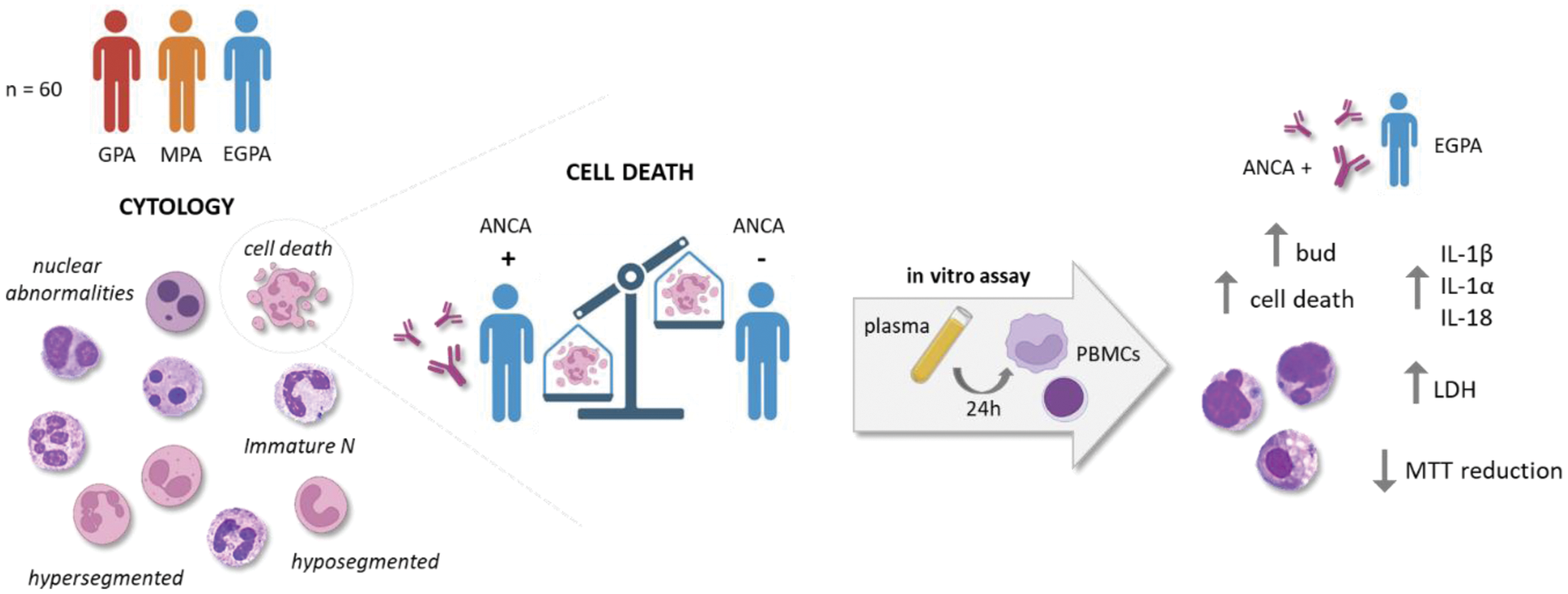 Methods: Blood samples were collected from adult patients affected by GPA (n = 17), MPA (n = 14) and EGPA (n = 29), classified according to the EULAR/ACR criteria 2022, who attended the outpatients Vasculitis Clinic of Padua University. All patients were no longer taking steroid therapy and were in the remission stage, as per the EULAR/ACR definition. May Grunwald-Giemsa staining was used to examine cellular morphology and to perform a cytogenic evaluation of leucocytes in air-dried blood smears. For in vitro assay PBMCs from healthy donors (HDs) were isolated by density-gradient centrifugation. EGPA patients selected for in vitro studies were subdivided into 3 groups: (1) EGPA ANCA-positive patients (ANCA++, n = 3), (2) EGPA ANCA-positive patients at diagnosis but negative the day of sampling (ANCA+, n = 3), (3) EGPA ANCA-negative patients (ANCA-, n = 3). PBMCs were primed with LPS (10 ng/ml) for 2 h, and then stimulated with 10% plasma from EGPA patients, from patients positive for antiphospholipid autoantibodies (IgG, controls) (n = 3) and from HDs (n = 3) for 24 h. The next day the MTT, trypan blue and LDH assay were performed and the supernatant and lysate were collected for IL-1β, IL-18 and IL-1α quantification.