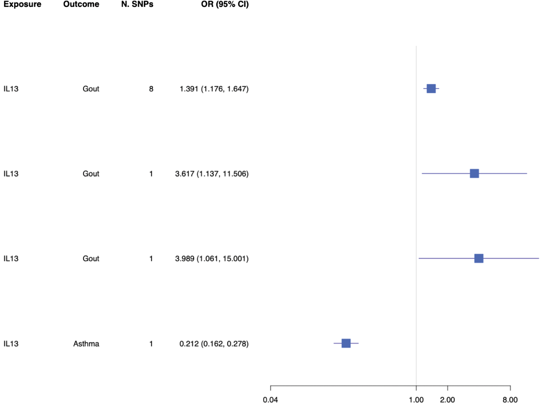 Conclusion: Our results suggest that the IL-13 pathway is implicated in gout pathophysiology independent of urate levels. However, genetically proxied IL-13 inhibition appears to increase the risk of gout. Further studies are required to characterise gout risk in those with hyperuricaemia and initiating IL-13 inhibitors.