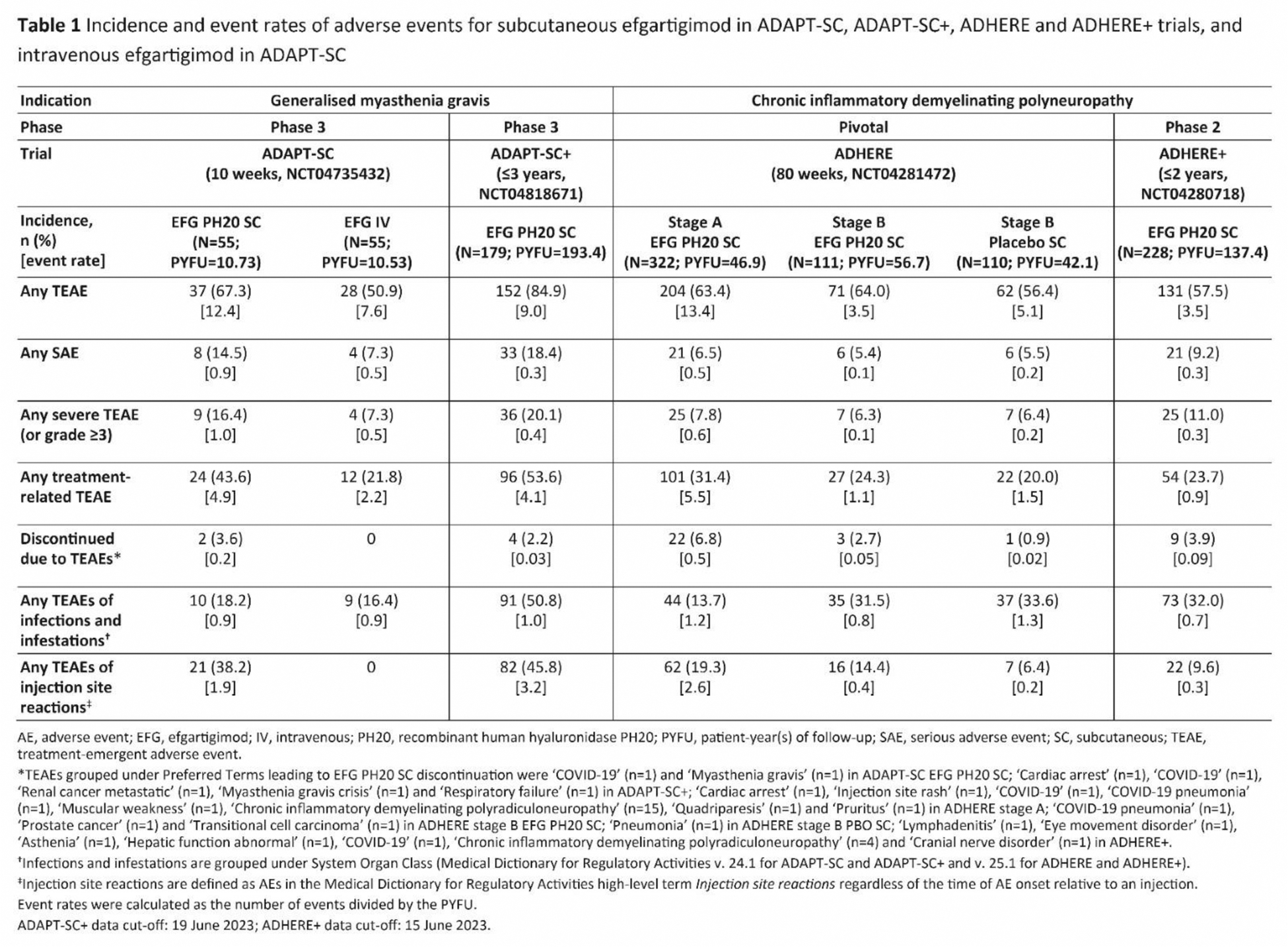 Results: Efgartigimod PH20 SC was well-tolerated and demonstrated a consistent safety profile across indications. Generally, similar rates of treatment-emergent adverse events (TEAEs) between efgartigimod and placebo were observed in ADHERE. A higher rate of injection site reactions (ISRs) was observed with efgartigimod PH20 SC versus placebo in ADHERE (Table 1). Most TEAEs were mild to moderate in severity across studies. There was no increase in TEAE rates, including infections, with repeated treatment. Event rates for AEs did not increase with exposure for MG or CIDP. Discontinuation rates due to TEAEs were consistently low, ranging from 0–6.8% across studies, and were similar to placebo. Discontinuations did not increase with longer exposure. ISRs were mild to moderate in severity, and only 1 participant (in CIDP studies) discontinued efgartigimod PH20 SC because of an ISR (rash at injection site). Efgartigimod PH20 SC did not reduce albumin or increase lipid levels.