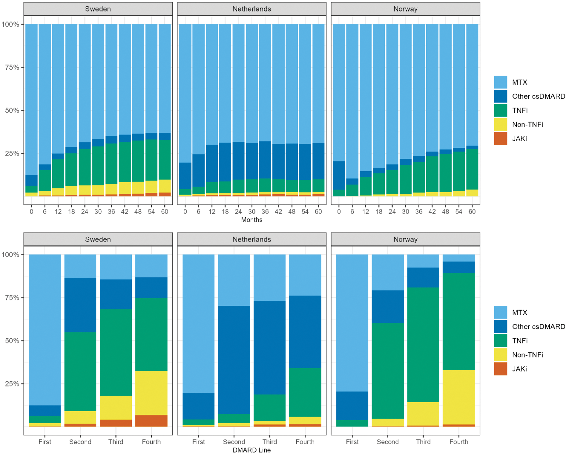 Methods: We used clinical and treatment-related data from three centers: Region Stockholm (Sweden, SW), Leiden (Netherlands, NL), and Oslo (Norway, NO) on patients newly diagnosed with RA who started their first ever DMARD from 2008-2023 (SW), 2011-2024 (NL), 2001-2012 (NO, follow-up ending in 2024). The type of DMARD initiated was categorised as MTX, other conventional synthetic DMARD (csDMARD: hydroxychloroquine, sulfasalazine, leflunomide, cyclosporine, azathioprine), tumor necrosis factor inhibitors (TNFi: adalimumab, infliximab, etanercept, certolizumab pegol, golimumab), non-TNFi (abatacept, anakinra, rituximab, tocilizumab, sarilumab), and Janus Kinase inhibitors (JAKi: tofacitinib, baricitinib, upadacitib, filgotinib). If a patient started two or more DMARD in combination, the patient was included in the respective type according to the following hierarchy: 1) TNFi, 2) non-TNFi, 3) JAKi, 4) MTX, and 5) other csDMARD. Combination therapy was defined as start of two DMARDs within 30 days without discontinuation of the first one. Thus, a patient starting e.g., a TNFi and MTX in combination was assigned to the “TNFi” category and marked as a “combination therapy”. Duration of treatment was defined as the time from the start of the DMARD and the earliest between the stop of the treatment and the start of the following line of treatment DMARD, and reported as median. Disease characteristics of patients at start of each line of DMARD were reported as mean and standard deviations.