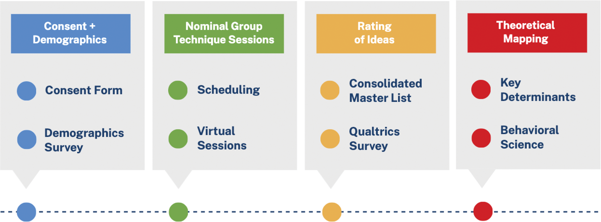 Results from theoretical mapping. Key determinants identified during the NGT are shown using colored circles. Determinants were mapped to TDF behavioral domains, which are displayed in colored text.