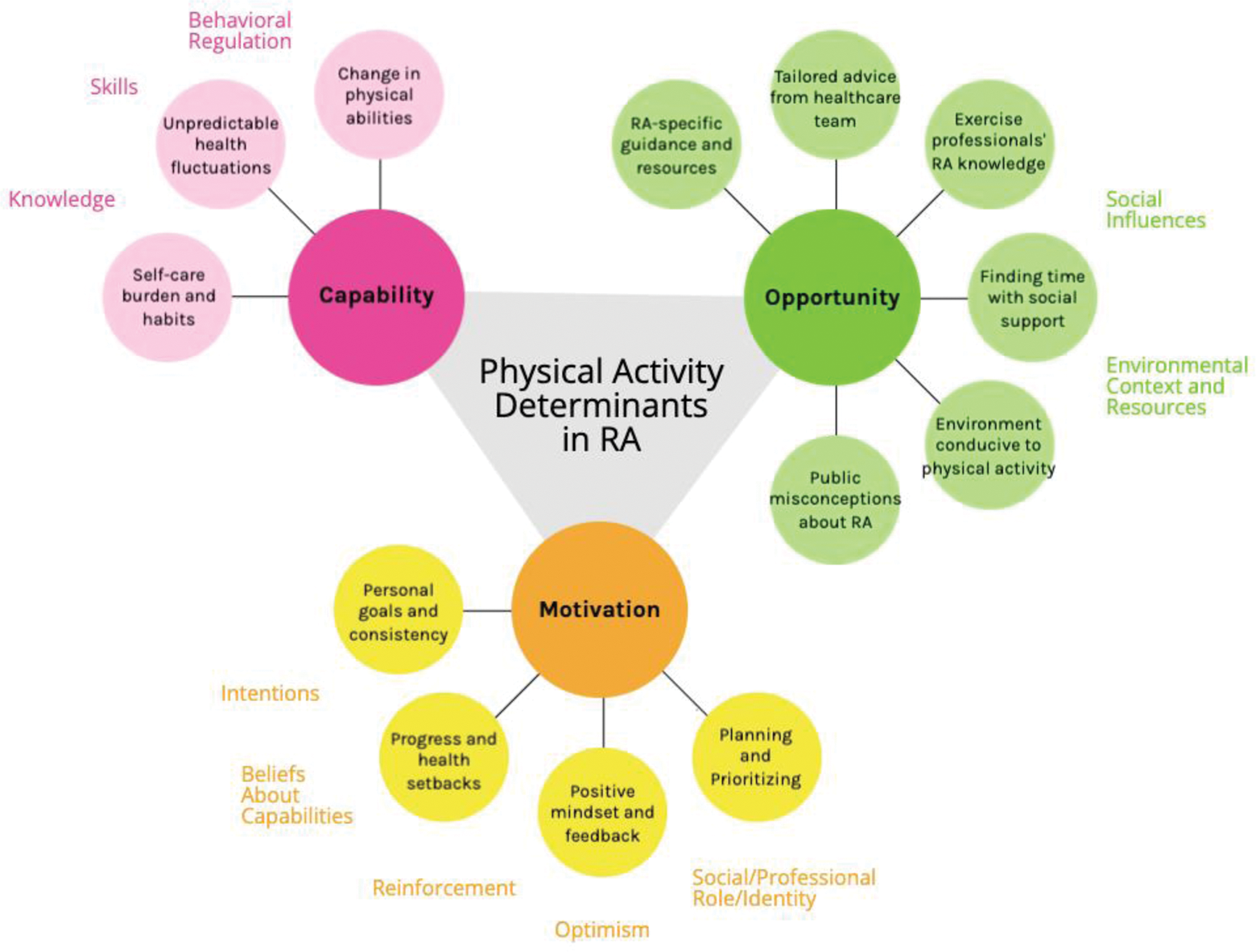 Conclusion: The priority setting identified the most important PA determinants among individuals with RA, which related to personal factors, social support, physical condition, and environmental factors. Theoretical mapping provided evidence-based, actionable insights for targeting these determinants and improving capability, opportunity, and motivation for PA in RA populations. These findings can inform development of resources, interventions, and clinical practices that support PA behavior change in RA care.