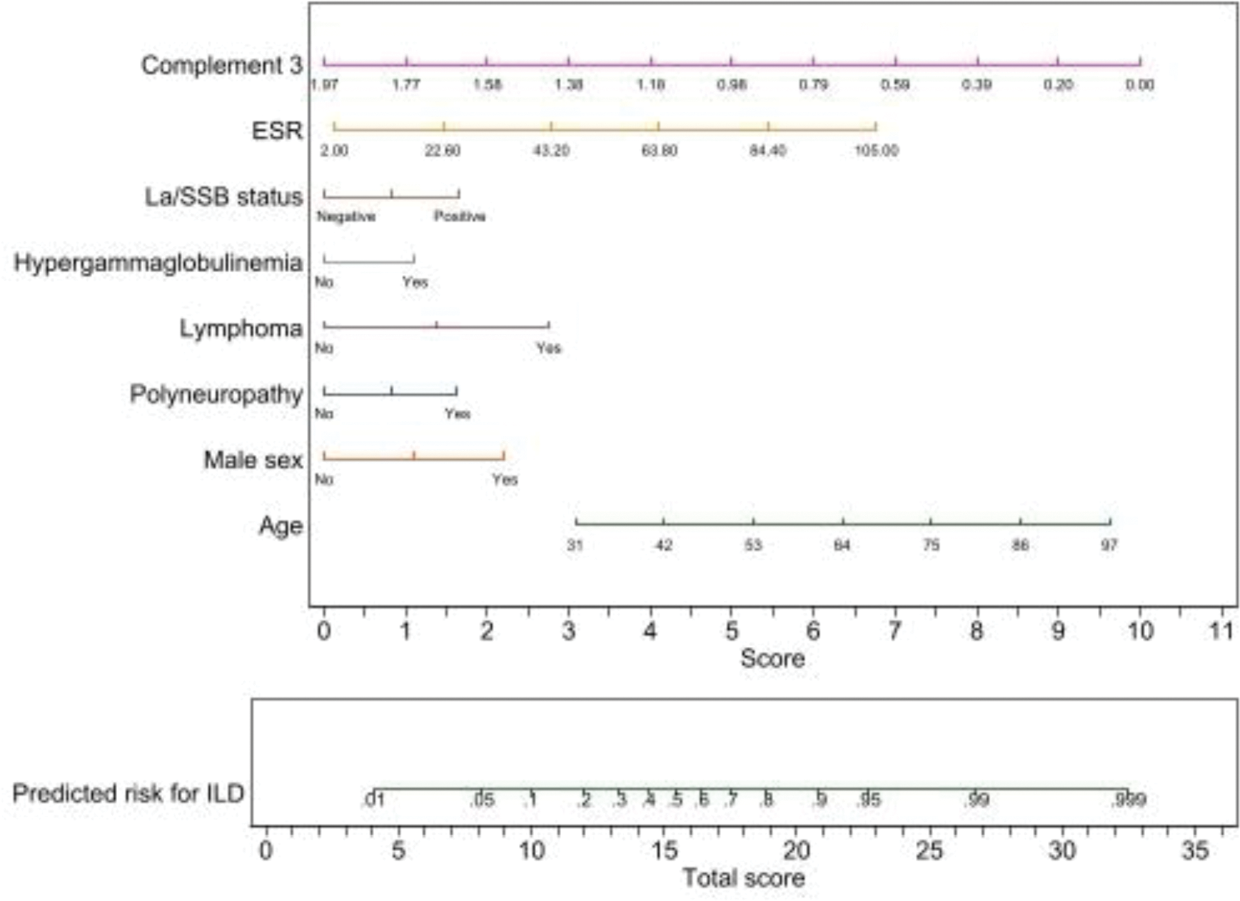 Nomogram estimating the ILD probability in SjD patients, informing HRCT referrals based on individual risk.