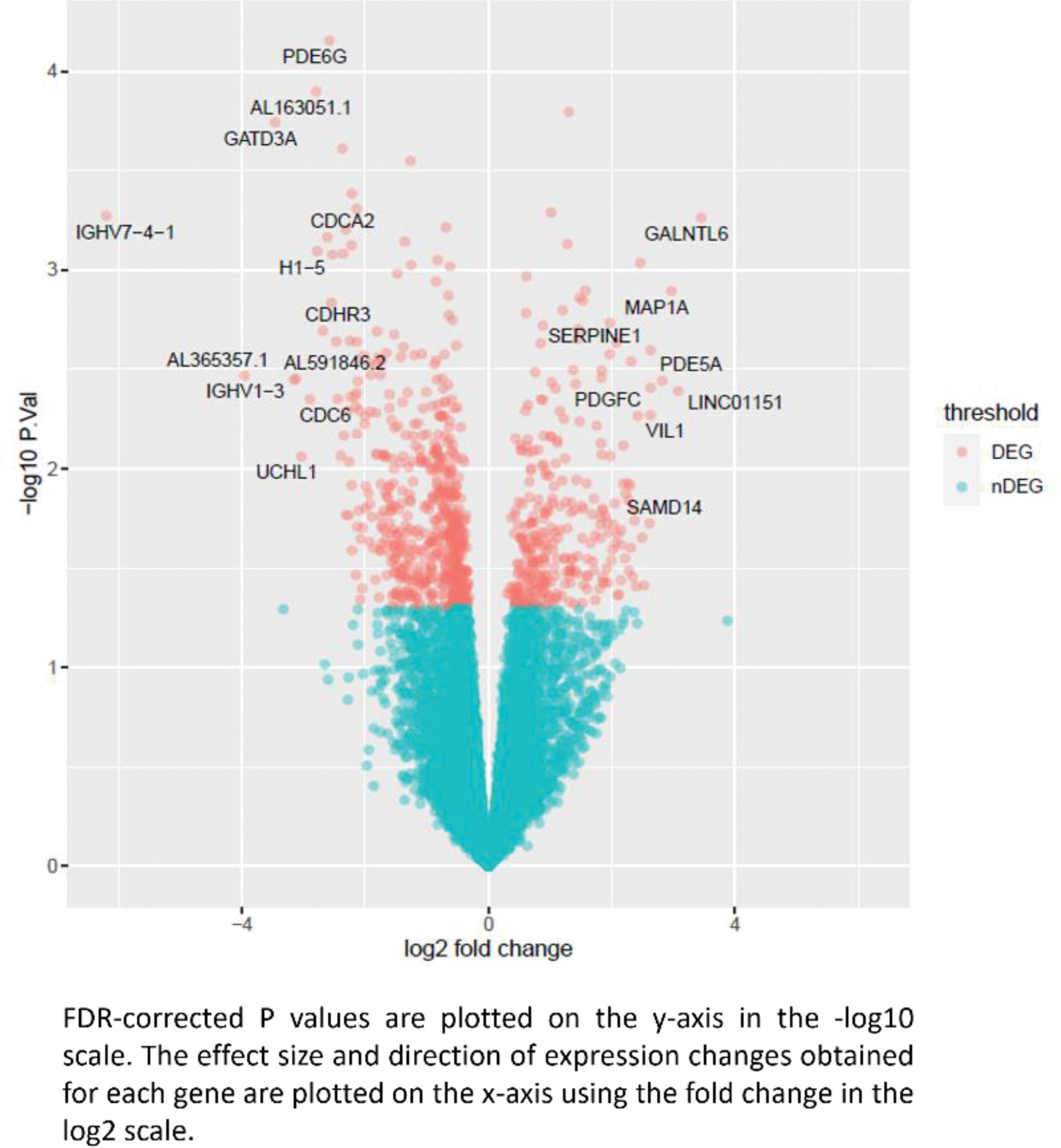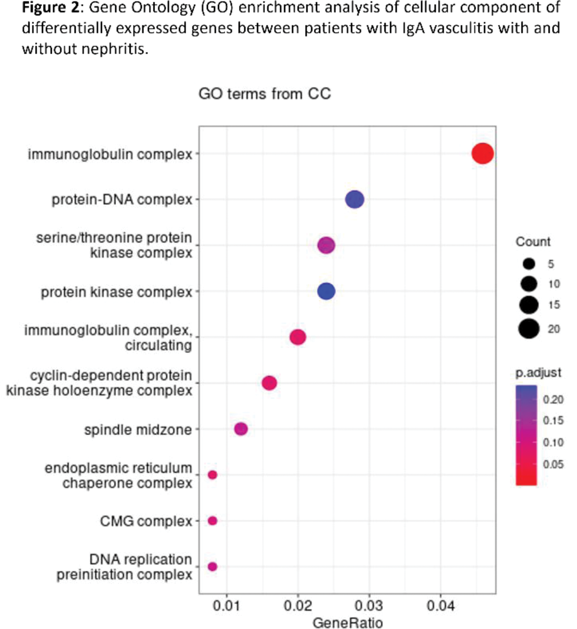 Results: Our preliminary results unveiled profound alterations in the transcriptome profile of peripheral B-cells from patients with IgAV who developed nephritis compared to those IgAV patients without renal damage. In this regard, our results revealed 672 differentially expressed genes (DEGs) across the whole genome between these groups of individuals. Among them, GALNTL6 (gene encodes a molecule involved in protein O-linked glycosylation), as well as MAP1A , SERPINE1 , PDE5A , and PDGFC , were amongst the most significant upregulated DEGs (Figure 1). By contrast, PDE6G, GATD3A, and CDCA2 were amongst the most significant downregulated DEGS (Figure 1). Interestingly, through gene ontology (GO) analysis of these data, we observed an enrichment in several cellular component, highlighting immunoglobulin complex (Figure 2).