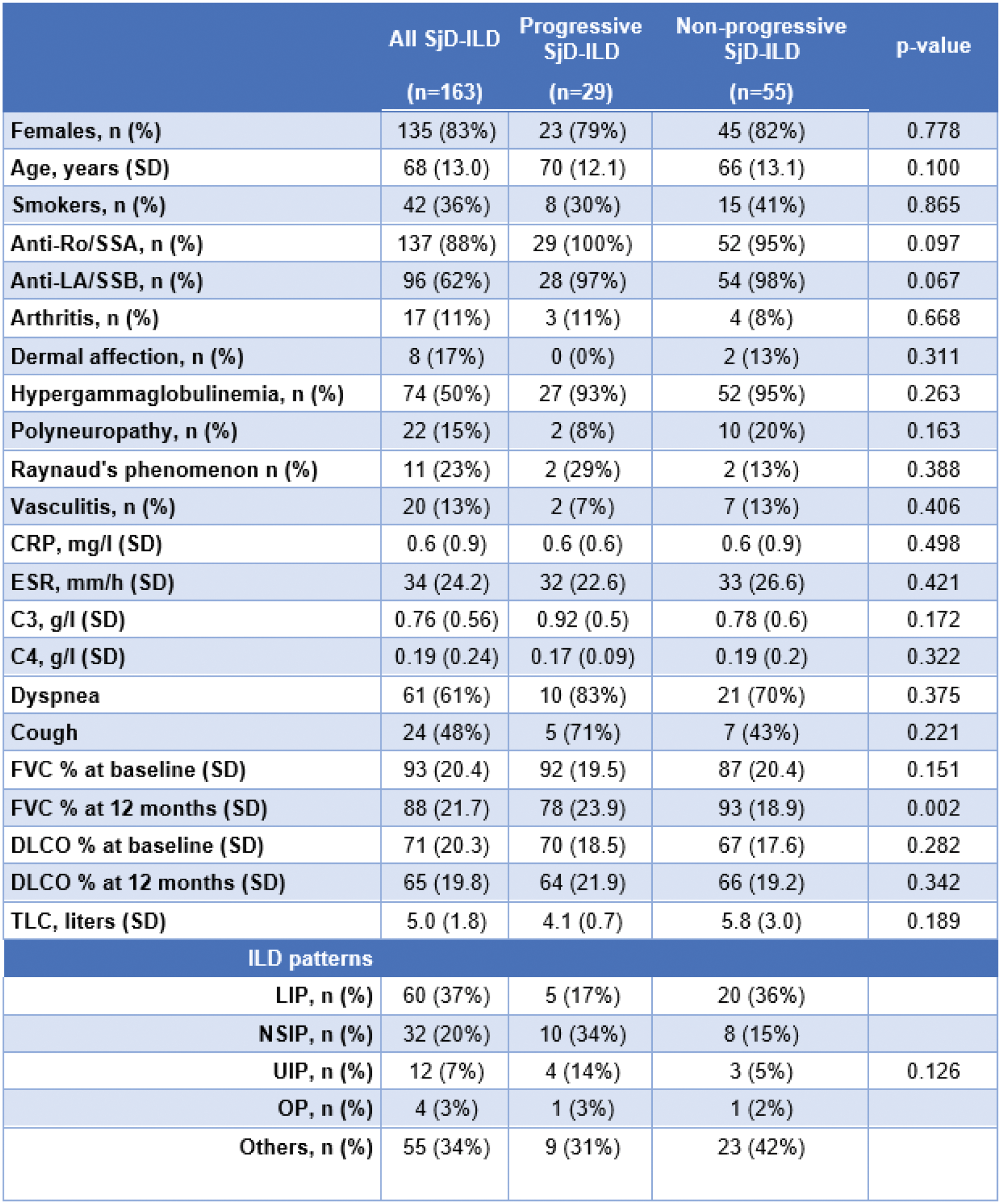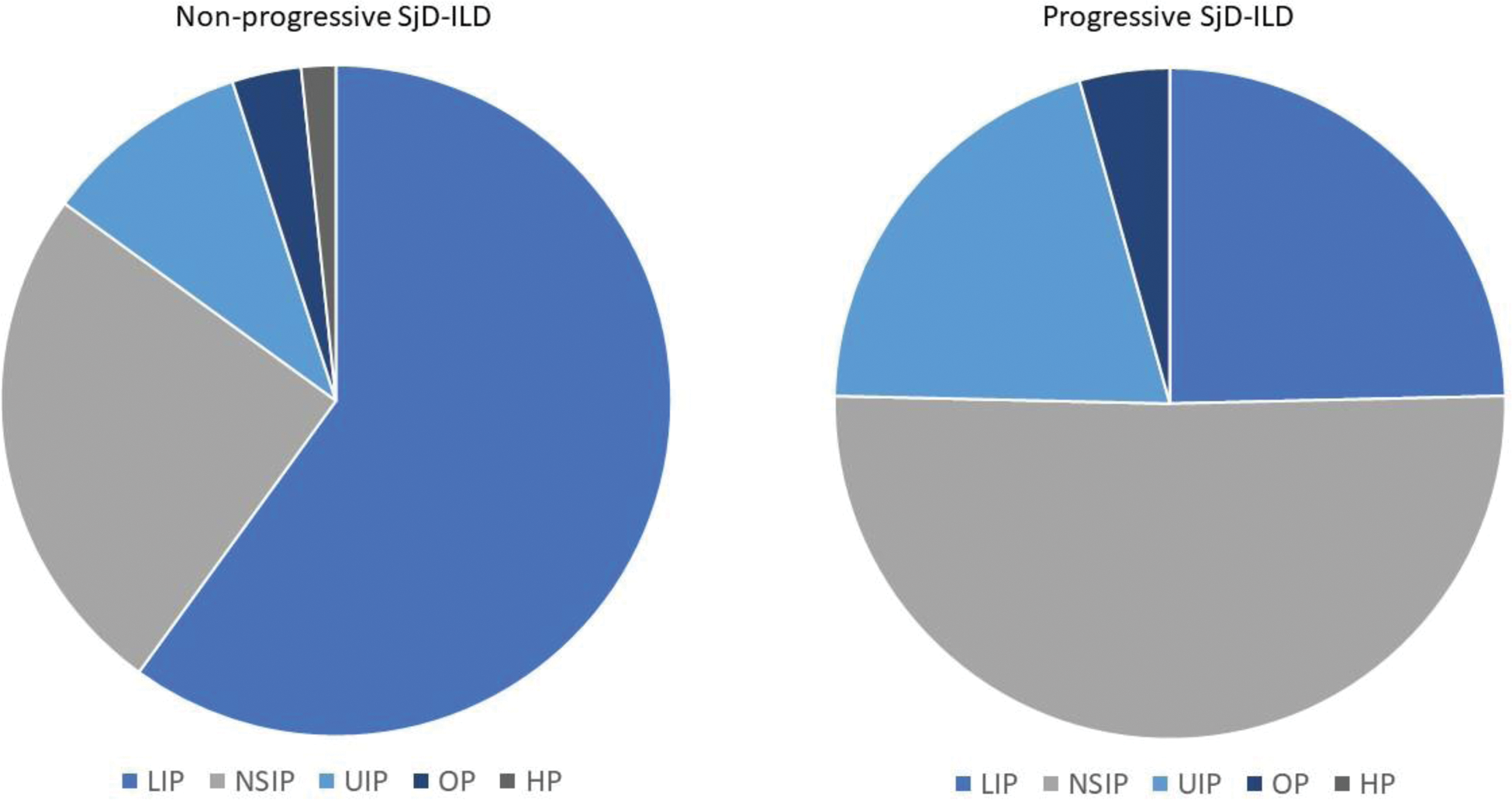 Conclusion: ILD frequently progresses in patients with SjD. However, identifying patients at risk for progression remains challenging. Importantly, while NSIP and UIP patterns emerged as the strongest risk factors for progression, a substantial proportion of patients with LIP also showed progression over a short follow-up period. These findings underscore the need for close monitoring of all patients with SjD-ILD to optimize management and improve outcomes.