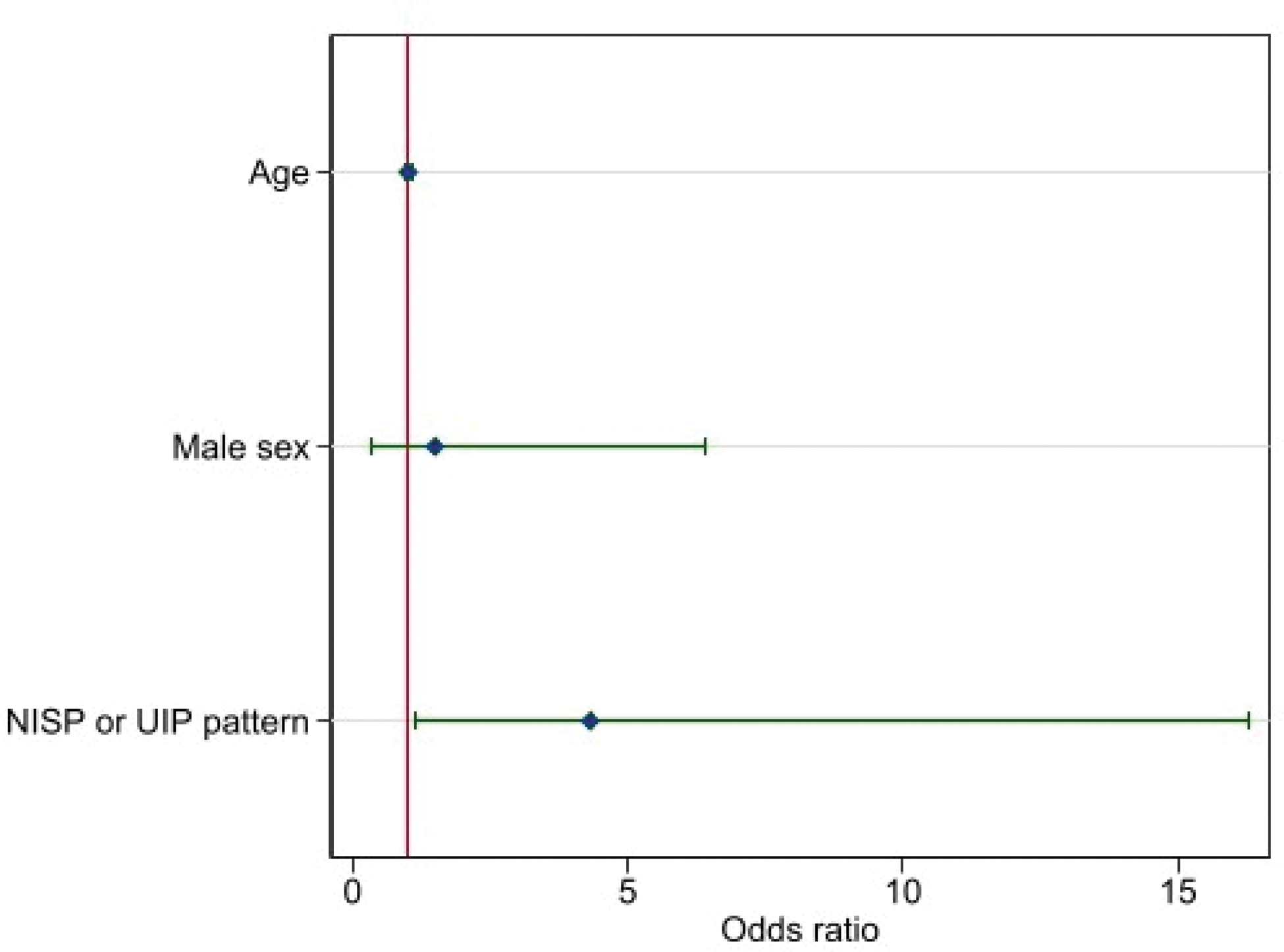Results: We identified 163 patients with SjD-ILD, of whom 84 (52%) had 12±6-month follow-up FVC data assessment (Table 1). Of these, 29 patients (34.5%) showed ILD progression. Among progressors, the mean FVC declined from 92% (SD 19.5) to 78% (SD 23.9), whereas non-progressors showed slight improvement from 87% (SD 20.4) to 93% (SD 18.9). No statistically significant differences in clinical or biological parameters were observed between progressors and non-progressors. While there were no significant differences in HRCT patterns between groups, progressive patients showed numerically higher rates of NSIP and UIP patterns. Notably, even patients with LIP experienced ILD progression in 17% of cases over 12 ±6 months. When evaluating predictors of ILD progression, demographic characteristics, SjD-specific features, and baseline lung function tests were not identified as significant risk factors. However, the presence of cough (OR 9.5, 95% CI 1.14–76.68, p=0.030) and NSIP or UIP patterns (OR 5.0, 95% CI 1.45–17.27, p=0.011) emerged as significant predictors in both univariable and multivariable logistic regression analyses (Figure 1B), with acceptable AUC values (AUC=0.71).