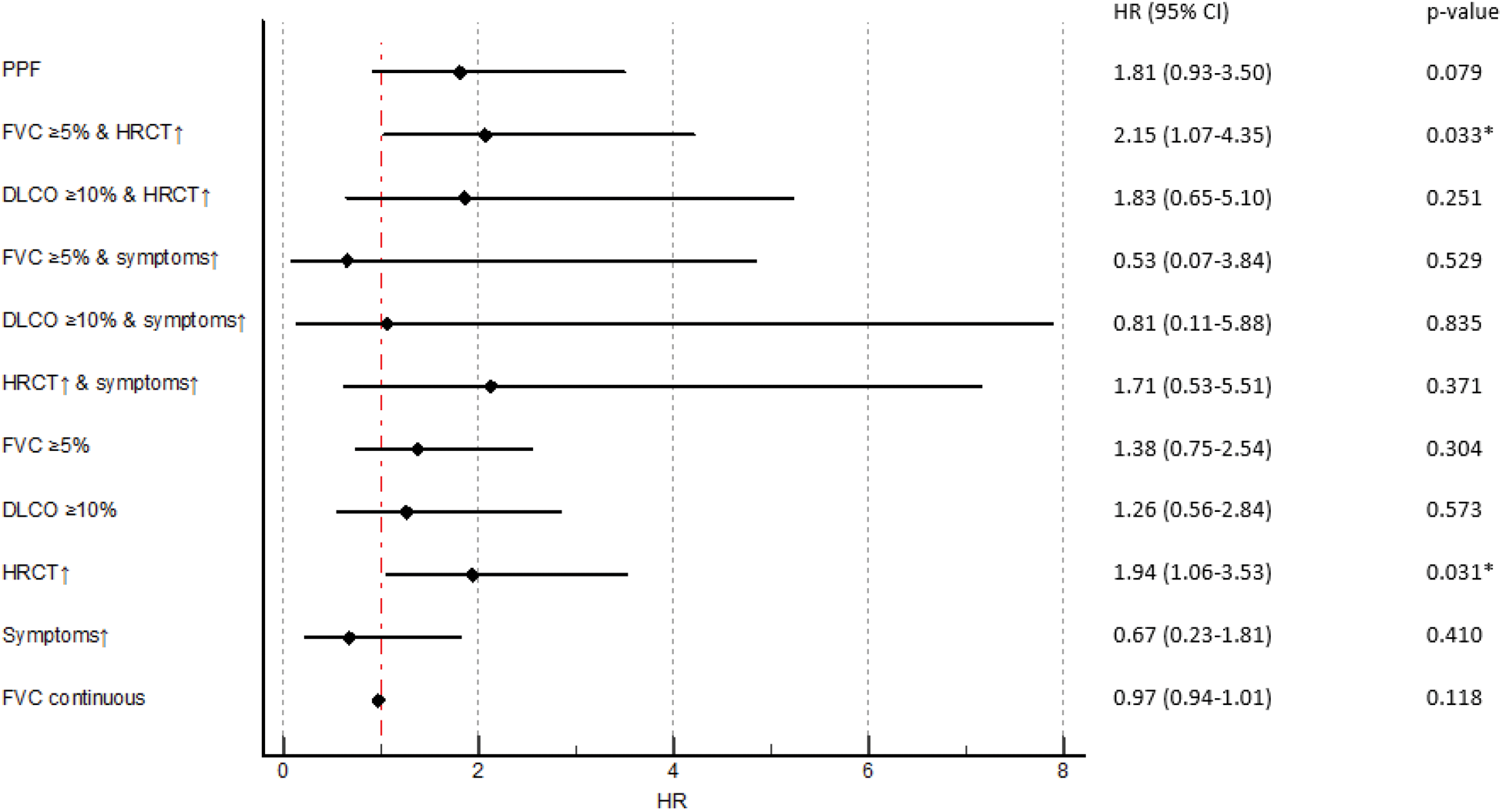 Conclusion: Worsening on HRCT is the driving subcriterion of the PPF criteria and the strongest predictor for reduced survival. Annual HRCT is therefore of high importance for timely identification of ILD progression in SSc and for assessing the risk of poor disease outcome. Not using HRCT may lead to missed opportunities for optimized disease management.