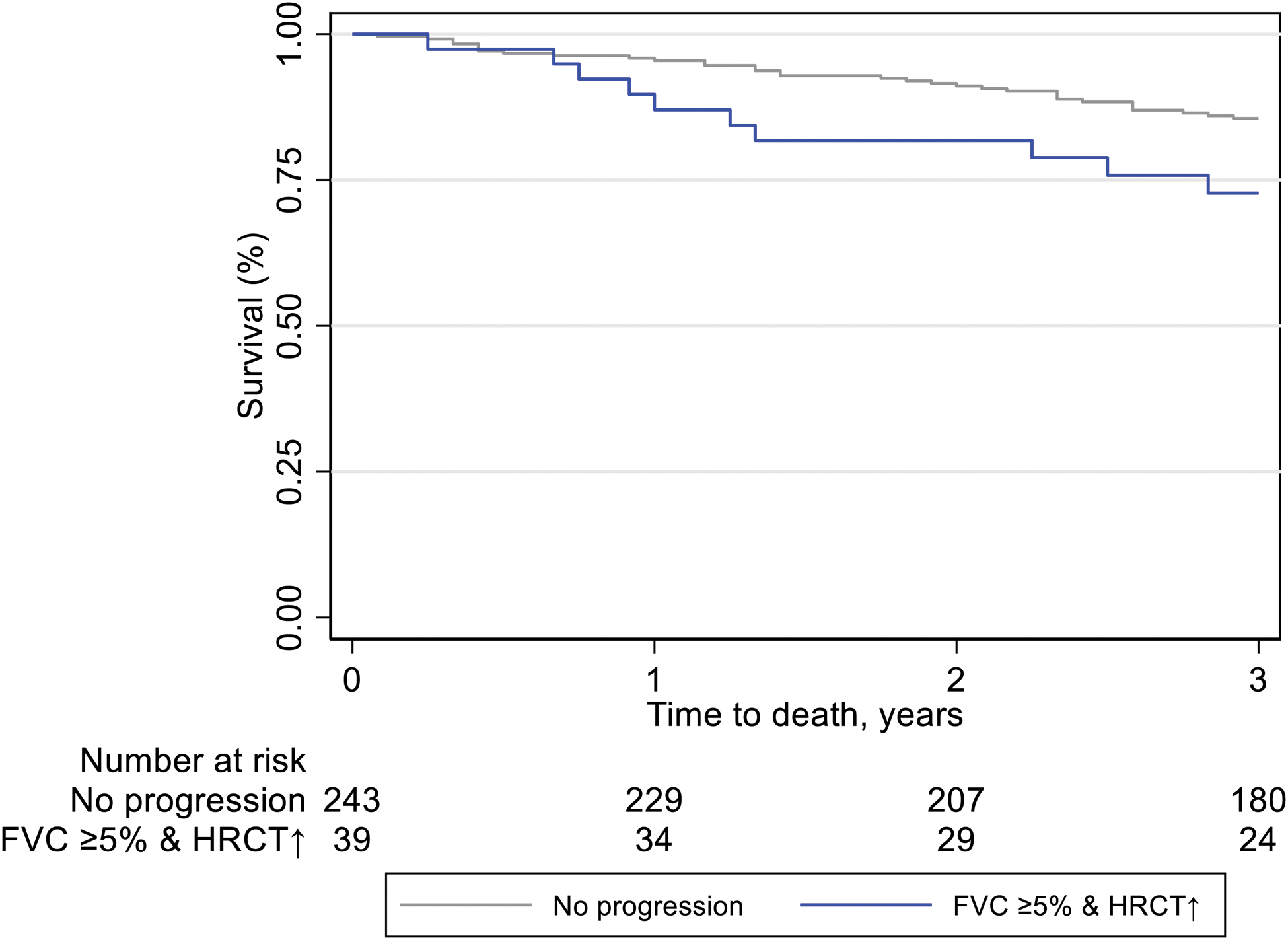 The impact of FVC decline and worsening of ILD on HRCT (blue) compared to no worsening (grey) on 3-year survival assessed by Kaplan-Meier estimates (p=0.039)
