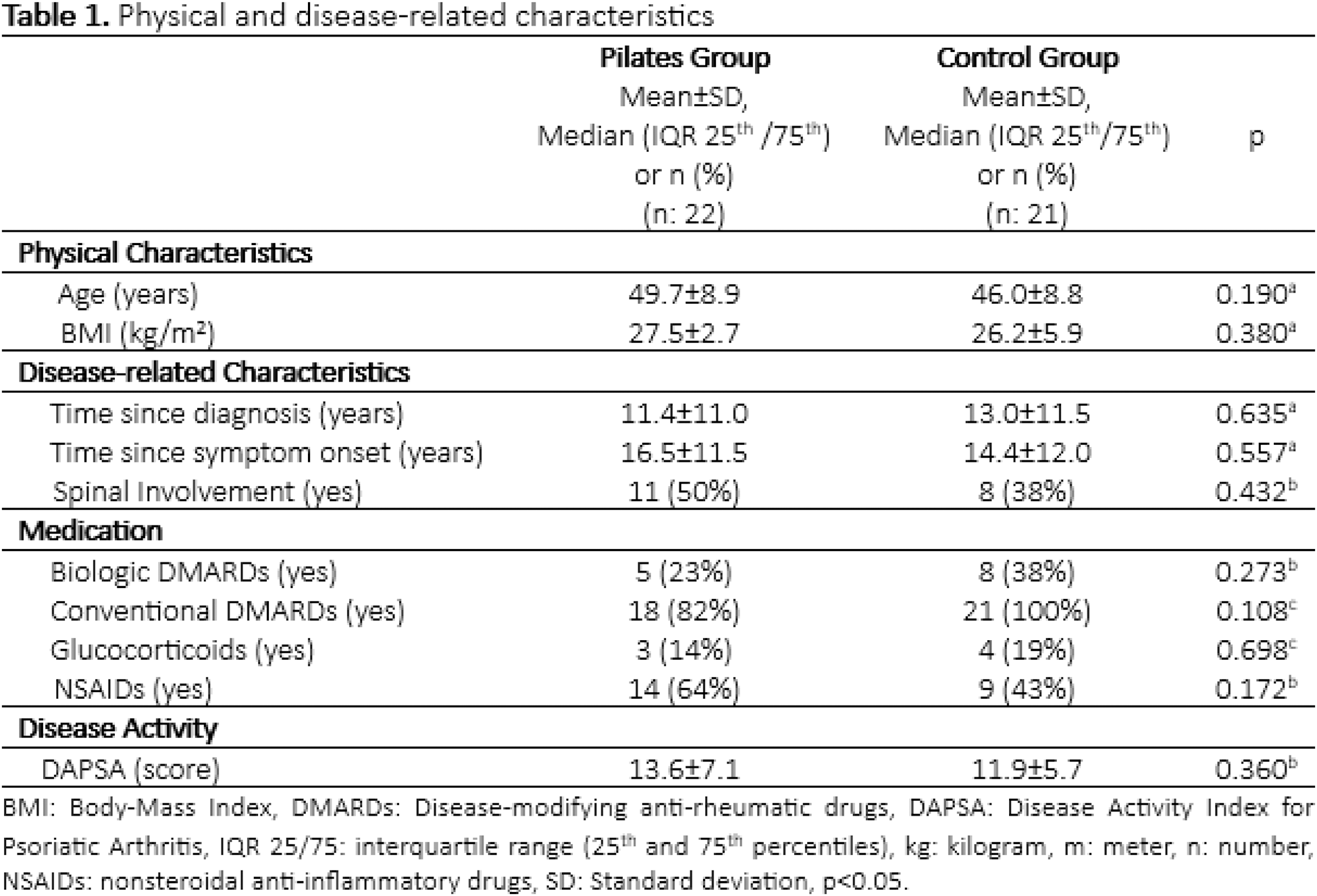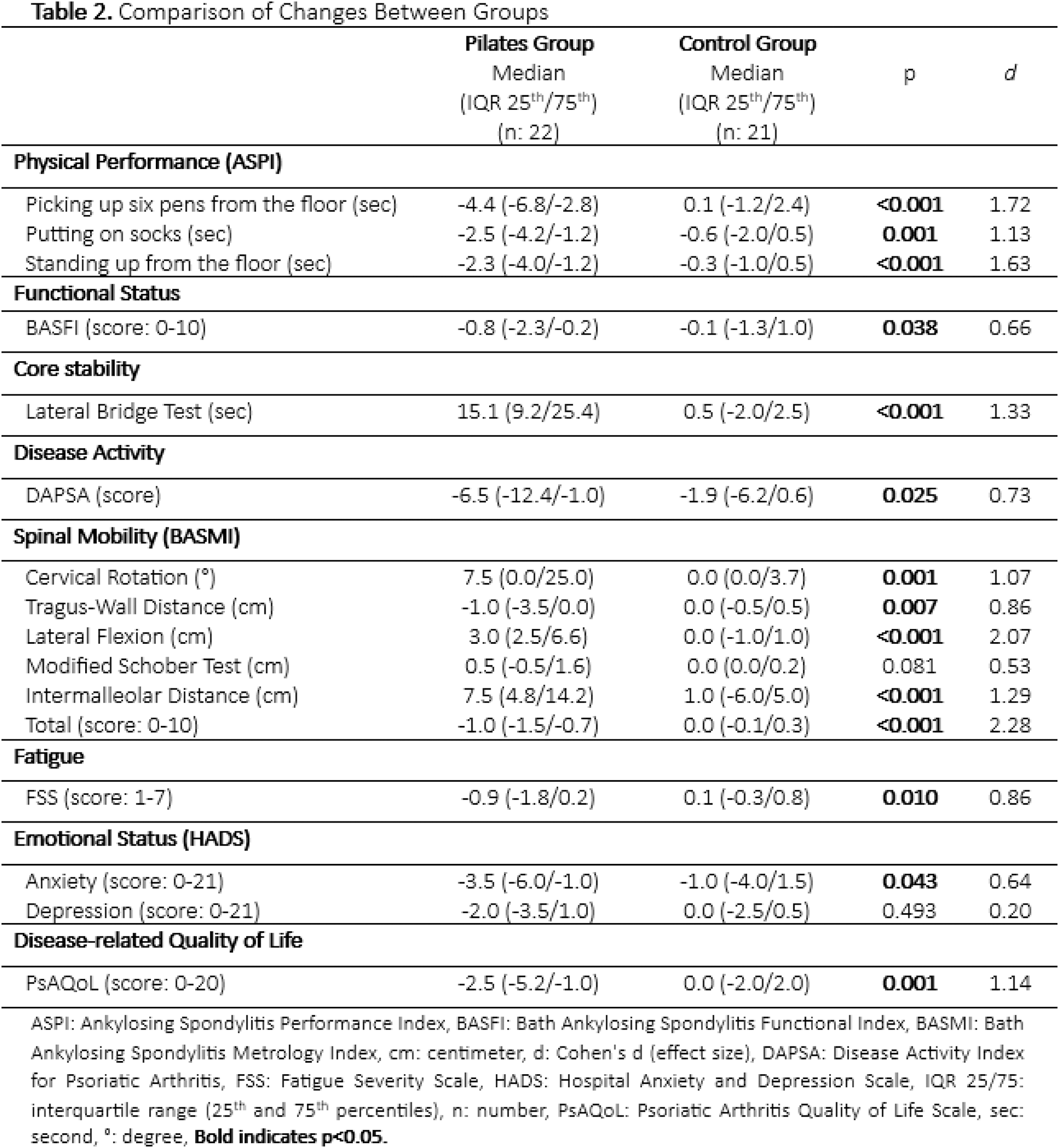 Results: The study was completed with a total of 43 women with PsA (Pilates group=22, control group=21). Groups were similar at the baseline regarding physical and disease-related characteristics (p>0.05, Table 1). Comparison of changes observed during the study revealed that the Pilates group demonstrated significantly greater improvements (p<0.05, Table 2) than the control group across all evaluated parameters, except for spinal mobility in the flexion direction and depression scores (p<0.05, Table 2).