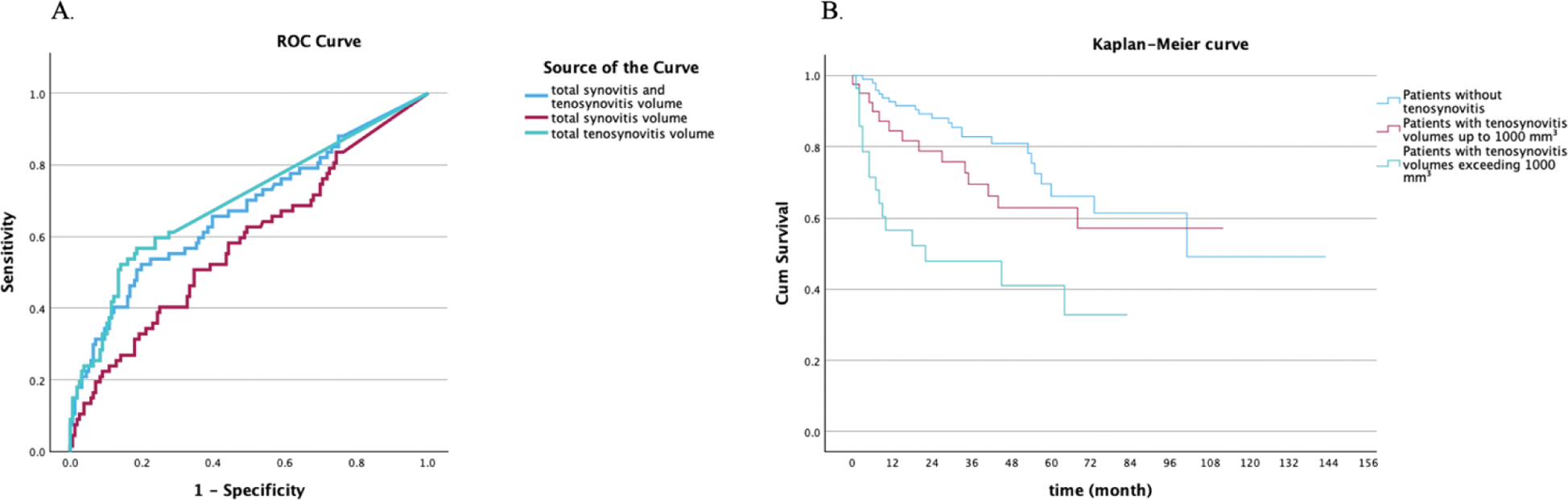 1a. ROC curve analysis comparing the predictive performance of total TSV, total SV and combined volumes for IA progression, with AUC values of 0.697, 0.582, and 0.672, respectively. 1b. Kaplan-Meier curve illustrating RA progression stratified into three groups: no tenosynovitis (n = 137), TSV up to 1000 mm³ (n = 53), and TSV exceeding 1000 mm³ (n = 33).