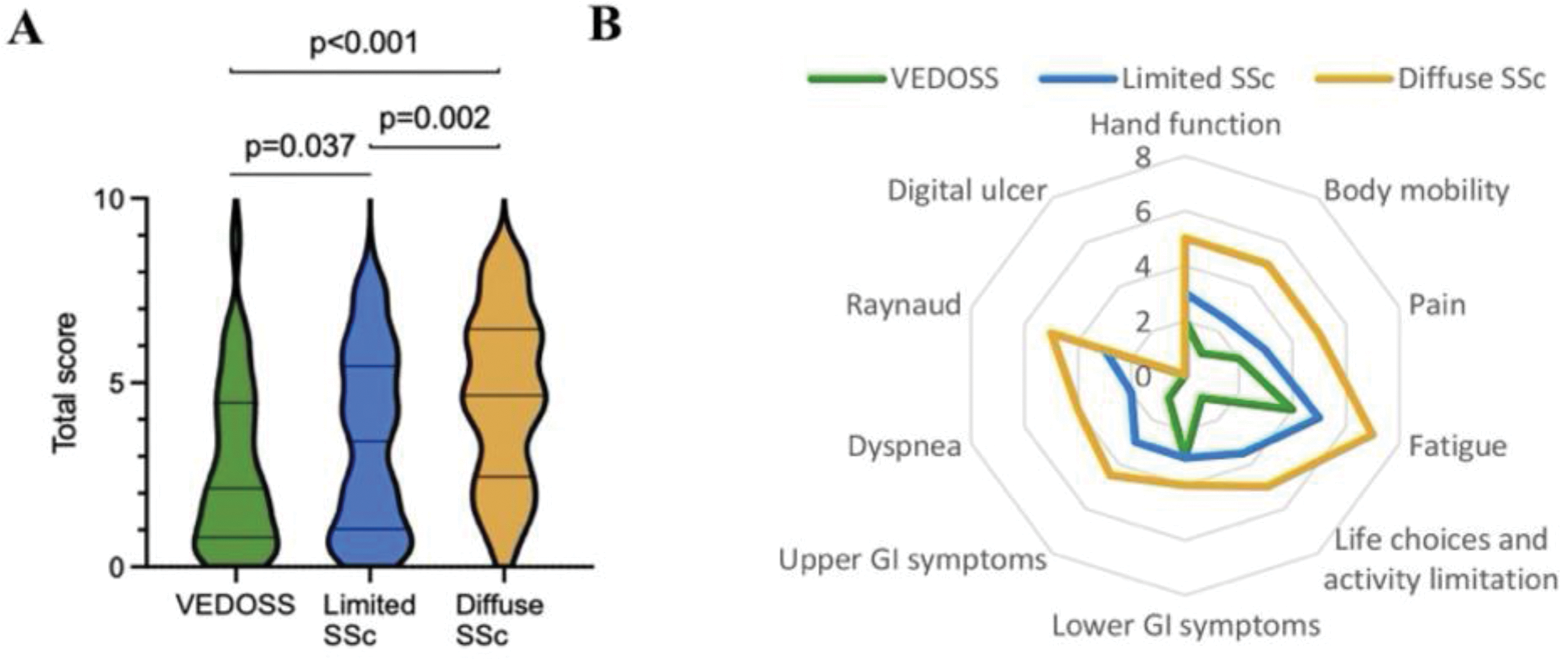 A. The violin plots of the median and 25-75 th quartiles ScleroID total scores of each disease subset. B . The radar graph of the median scores of each subitems according to disease subsets with the color chosen.
