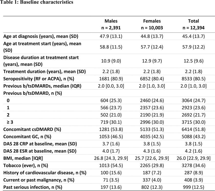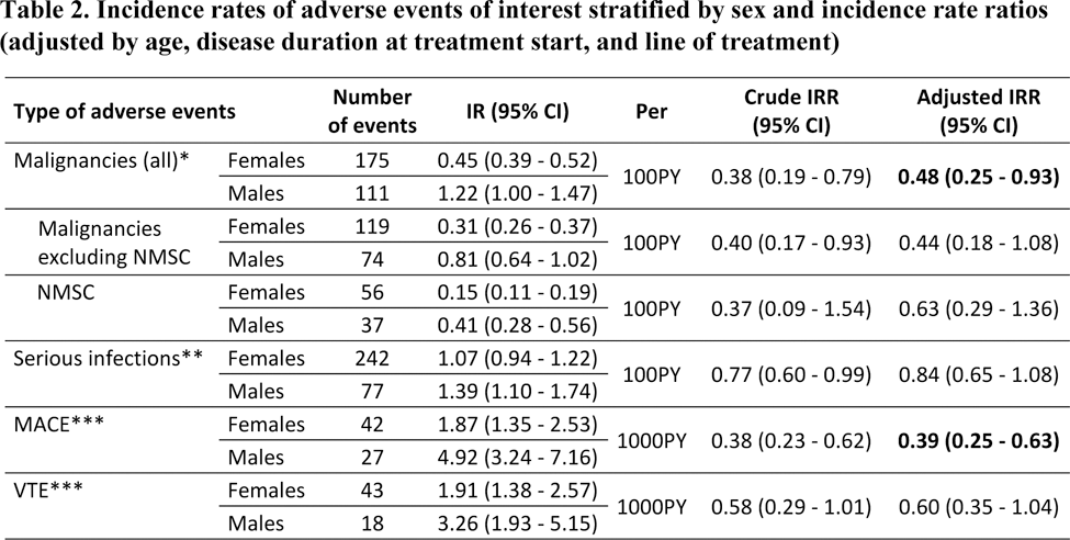 Results: Of the 65,203 RA patients considered, 12,394 initiated JAKi treatment between 2013 and 2024, and were included for analysis. Patients were mostly females (80.7%), initiated JAKi treatment at a mean age of 57.9 years. The median number of previous b/tsDMARD was 2, thus most treatments courses were a third or later treatment line (21.7%) (Table 1). Overall, patients had similar clinical characteristics, although males seemed to have a later onset of RA and thus a shorter disease duration at treatment start. In addition, males had a higher proportion of overweight/obesity compared to females (67% vs 55.6%), of smokers (54.5% vs 29.8%) and of cardiovascular disease (15.6% vs 7.2%). A total of 286 malignancies (93 NMSC), 1775 infections (319 serious), 69 MACE and 61 VTE were reported. IRs and crude IRRs were lower among females for all events of interest. While the incidence of all malignancies (including NMSC) was significantly lower among female patients (aIRR=0.48 [95% CI: 0.25-0.93]), no differences were found when stratifying by malignancies excluding NMSC, and by NMSC (Table 2). The adjusted incidence rate of serious infections was not significantly different either (aIRR=0.84 [95% CI:0.65-1.08]). Females had a significantly lower incidence of MACE (aIRR=0.39 [95% CI: 0.25-0.63]), yet no significant difference in the incidence of VTE (aIRR=0.60 [95% CI: 0.35-1.04]) was observed between females and males.