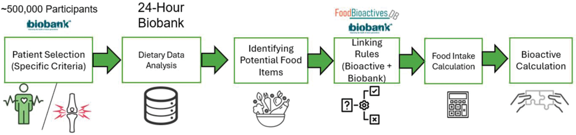 Objectives: The aim of this study is to develop a systematic mapping approach to integrating 24-hour dietary questionnaire data in UKBB with a comprehensive food bioactives database, FoodBioactivesDB [1], to deliver new insight into the contrasting dietary composition of people with RA and OA. FoodBioactivesDB (FBDB), derived from the validated eBASIS platform, contains over 12,000 unique records across 170 distinct food types and implements the NCI (National Cancer Institute) Method [2] to accurately quantify dietary bioactive patterns.