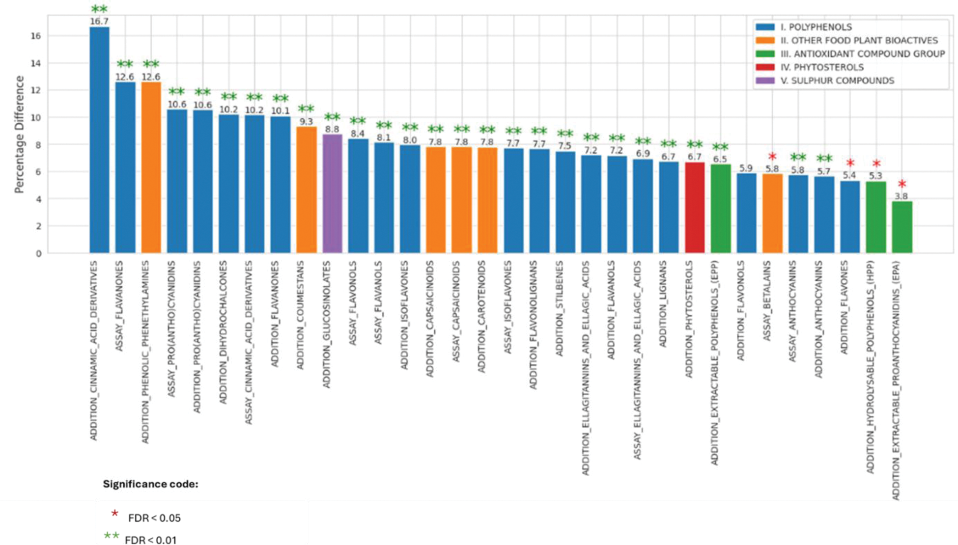 Results: Analysis of 502,172 UKBB participants identified 68,629 individuals with documented arthritis phenotypes (RA: n=10,537; OA: n=58,092). The bioactive mapping framework characterised 32 distinct bioactive compounds across five major categories (polyphenols, antioxidants, phytosterols, sulphur compounds and other food plant bioactive). Statistical analysis revealed that 27 bioactives were significant at FDR < 0.01 (Figure 2). The highest percentage differences between RA and OA were observed for the Addition of Cinnamic Acid Derivatives (16.7%, FDR < 0.01), followed by Assay Flavanones and the Addition of Phenolic Phenethylamines (both 12.6%, FDR < 0.01). Notable differences were also seen in Assay Pro(Antho)Cyanidins and Addition Pro(Antho)Cyanidins (both ~10.6%, FDR < 0.01). The smallest significant differences were observed in Addition EPA (3.8%, FDR < 0.05), Addition HPP (5.3%, FDR < 0.05), and Addition Flavones (5.4%, FDR < 0.05). Five compounds showed no significant differences at FDR < 0.01: Addition Flavonols, Assay Betalains, Addition Flavones, Addition Hydrolysable Polyphenols (HPP), and Addition Extractable Proanthocyanidins (EPA).