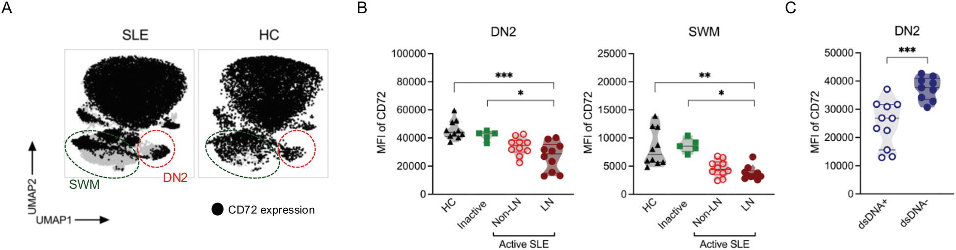 Downregulation of surface CD72 in lupus double negative 2 and switched memory B cells. (A ) UMAPs represented the CD72 expression in SLE patients and HC. (B ) Decreased CD72 expression in DN2 and SWM of lupus nephritis patients. (C ) DN2 of anti-dsDNA positive patients displayed a decreased CD72 expression.