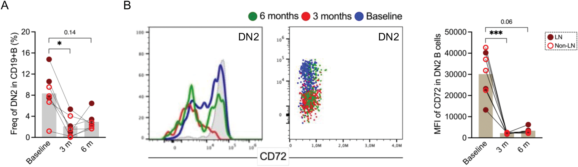 Loss of CD72 expression in double negative 2 B cells after treatment. (A ) Frequency of DN2 at baseline and follow-up time points (3 and 6 months) in patients. (B ) Histogram overlays and dot plots (left panel: grey histogram represented healthy DN2) represented CD72 expression and MFI of CD72 (right panel) in lupus DN2 at different time points.