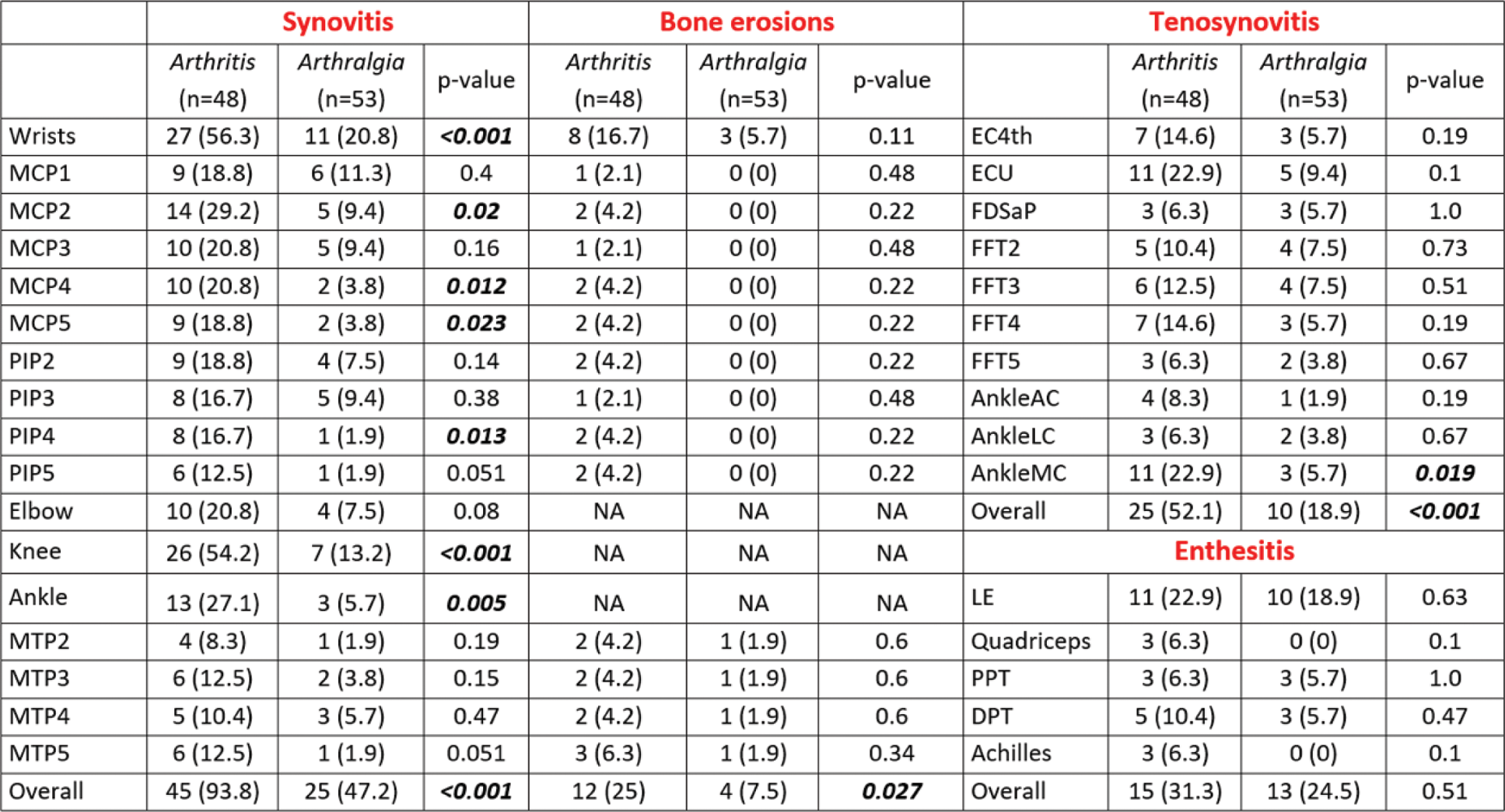 Methods: Cancer patients who developed clinical arthritis (joint pain and swelling on physical examination) or arthralgia (joint pain without clinical arthritis) after receiving ICIs were consecutively recruited across six centres internationally. All participants underwent clinical and ultrasound evaluations. Ultrasound assessments included 18 joints bilaterally (for synovitis and bone erosions), 10 tendons (for tenosynovitis and tendon damage), and 5 entheses (for “active” enthesitis and entheseal bone erosions) at various anatomical sites, using the Outcome Measures in Rheumatology (OMERACT) definitions (1). Statistical analyses, including chi-square and Fisher’s exact tests, compared the prevalence and distribution of ultrasound-detected inflammation between the two groups.
