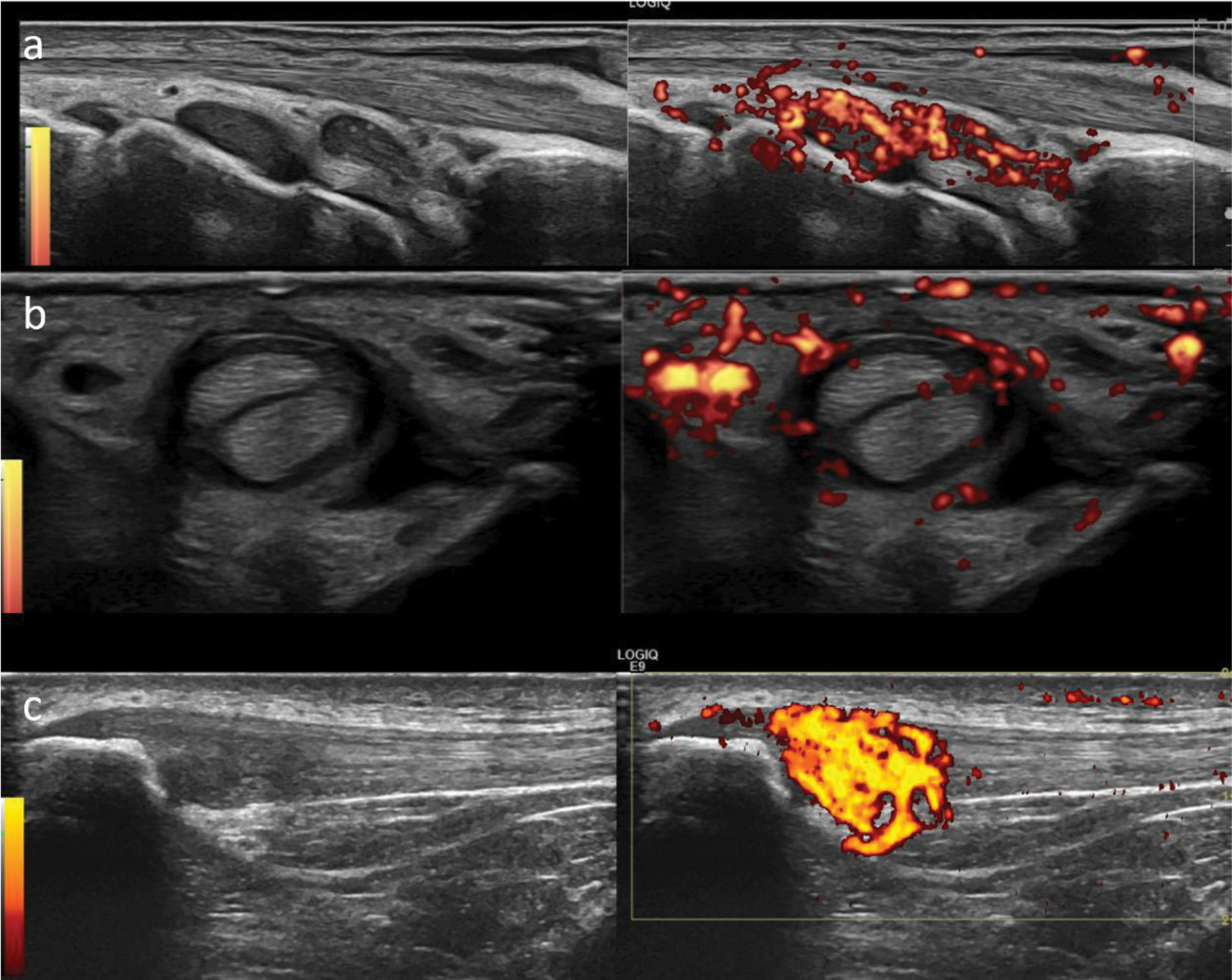 Legend . Images show wrist synovitis (a), 3rd finger flexor tendon tenosynovitis (b) and proximal patellar tendon enthesitis (c).