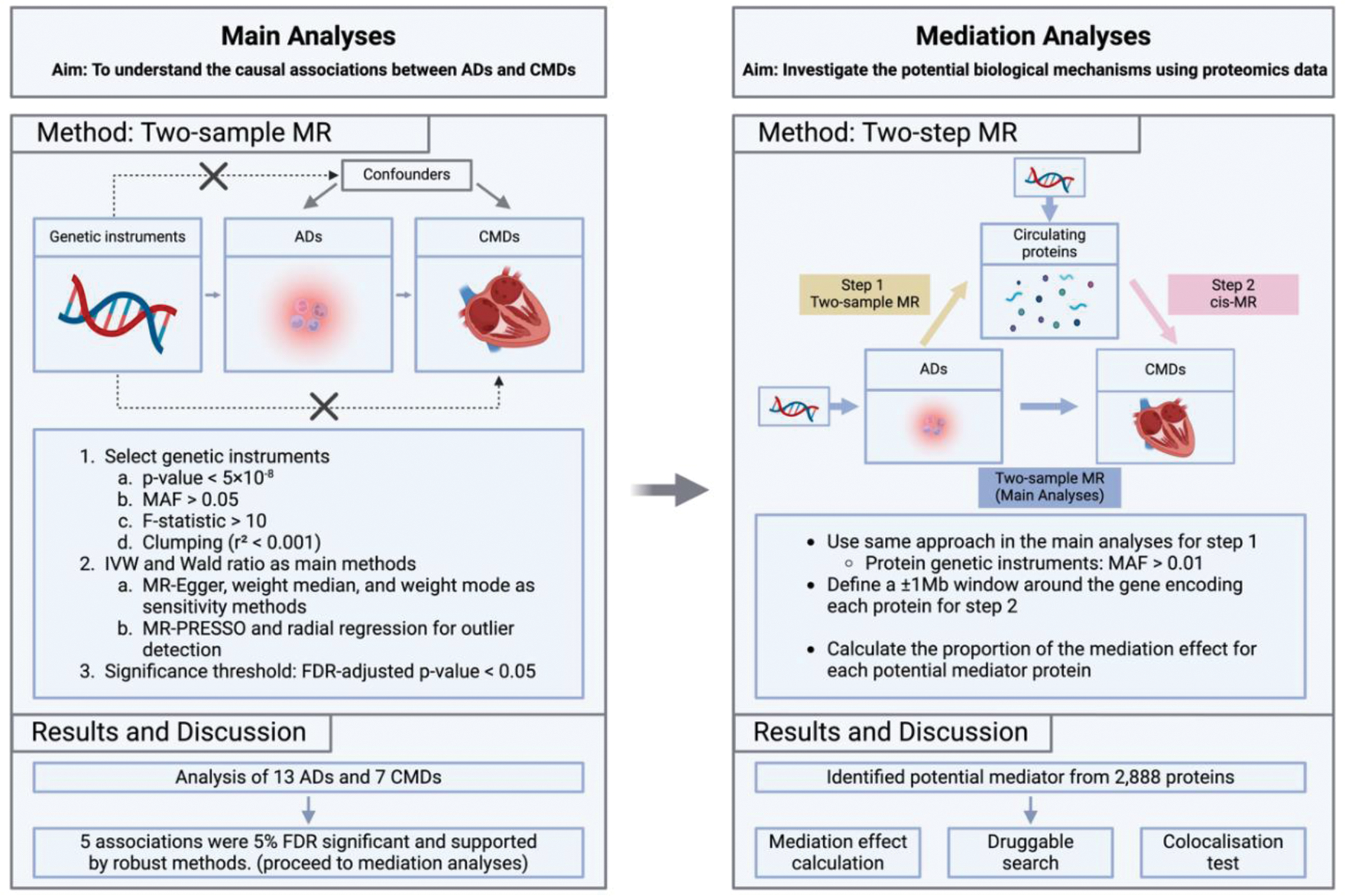 Objectives: This study aimed to (1) elucidate the potential causal associations between ADs and CMDs, and (2) identify and characterise the plasma proteins important to the relationship between these two groups of diseases.