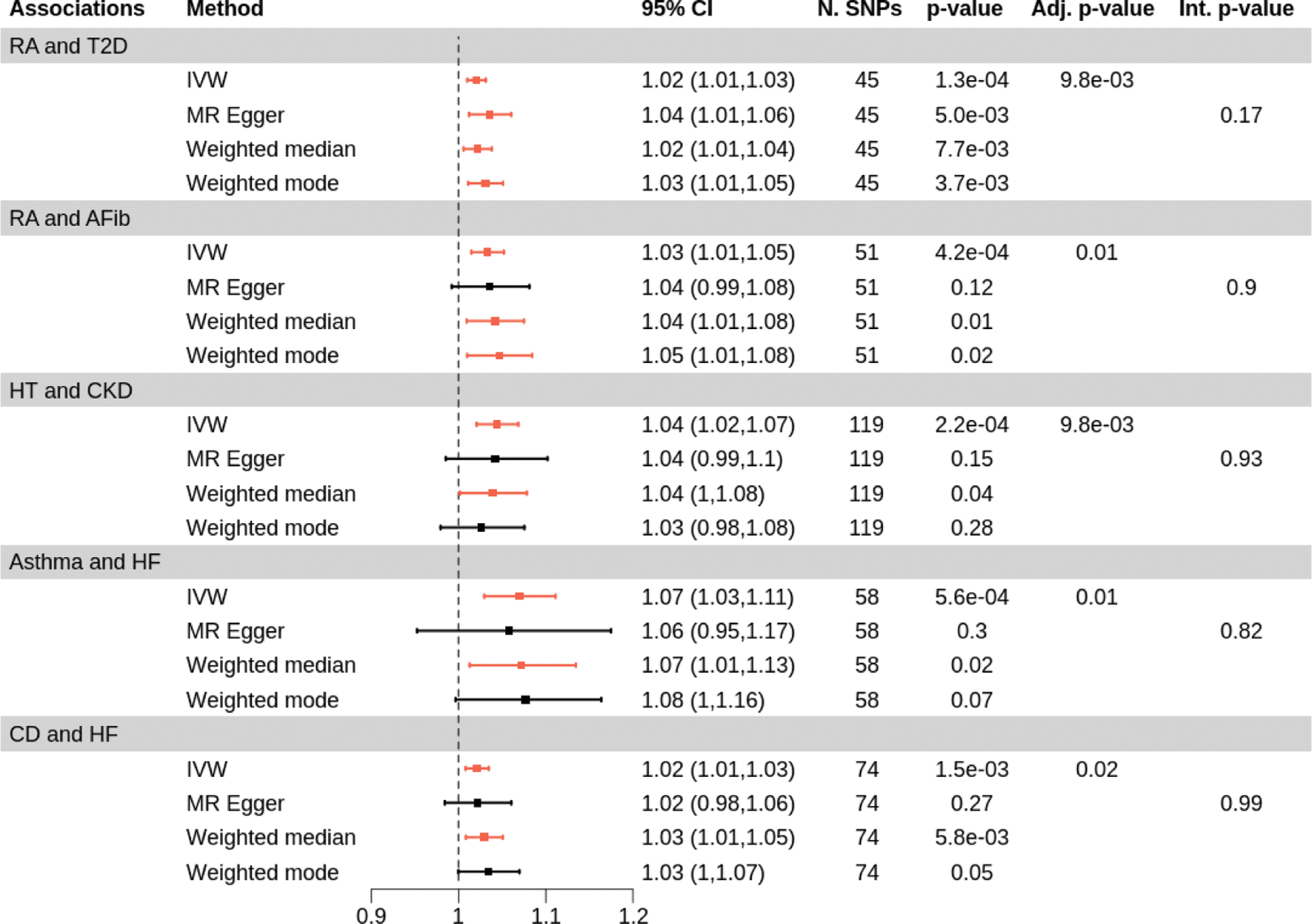 Forest plots for 5 FDR significance associations. RA, rheumatoid arthritis; T2D, type 2 diabetes; AFib, atrial fibrillation; HT, Hashimoto’s thyroiditis; CKD, chronic kidney disease; HF, heart failure; Adj. P, adjusted p-value; N. SNPs, number of SNPs; Red, significant; Black, insignificant.