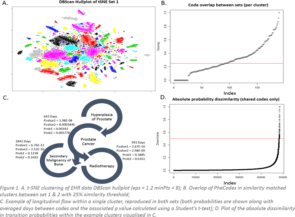 Methods: The Partners HealthCare Biobank from Boston, Massachusetts, includes 64,819 patients with longitudinal visit data from hospitals and general practitioners between June 1987 and June 2017. Each visit and procedure (N = 24,377,442) is coupled to an ICD code (International Classification of Disease) describing a disease or examination. We randomly split the data into two datasets of 32,424 and 32,395 individuals: set 1 to optimise t-SNE and DBScan and set 2 for replication. To trim the overly detailed hierarchy of ICDs, we translated them to Phenotype Codes (PheCodes).[3] t-SNE further reduced dimensionality and indicated groups of patients based on their PheCodes and separated patients based on PheCode patterns rather than singular codes. Subsequently DBScan identified clusters of patients in t-SNE space, by grouping patients based on relative Euclidean distance. Finally transition-probability matrices were constructed for all codes in each cluster, from which probabilistic sequences could be constructed.