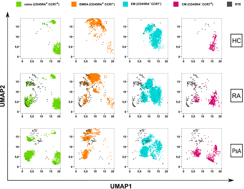 , we could see no significant differences between patients and controls. A first global analysis of CD45RA and CCR7 on CD4 and CD8 via UMAP revealed that RA and PsA RTEs cluster together with naїve and effector cells (