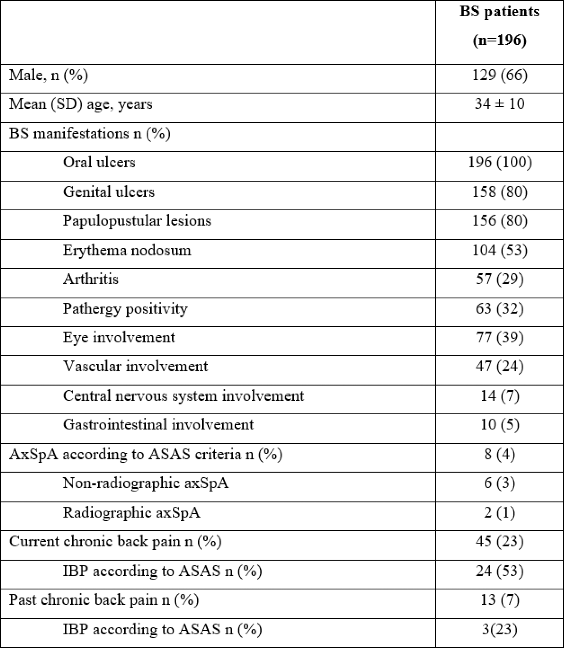 Methods: We included 196 consecutive BS patients under the age of 45 who fulfilled the criteria set by the International Society Group for BS. The patients who meet the ASAS definition of chronic back pain underwent screening for ASAS classification criteria for axSpA. All patients who reported current or past chronic back pain underwent further evaluations including HLA-B27 and C-reactive protein testing, X-ray, and magnetic resonance imaging (MRI) of the sacroiliac joints, in addition to the assessments of other SpA features. Inflammatory back pain (IBP) was assessed by ASAS criteria. The radiographic images were reviewed by two experienced radiologists. A one-sample exact test was used to compare the prevalence of axSpA in BS patients against the general population, which has a axSpA prevalence of 1.4%.