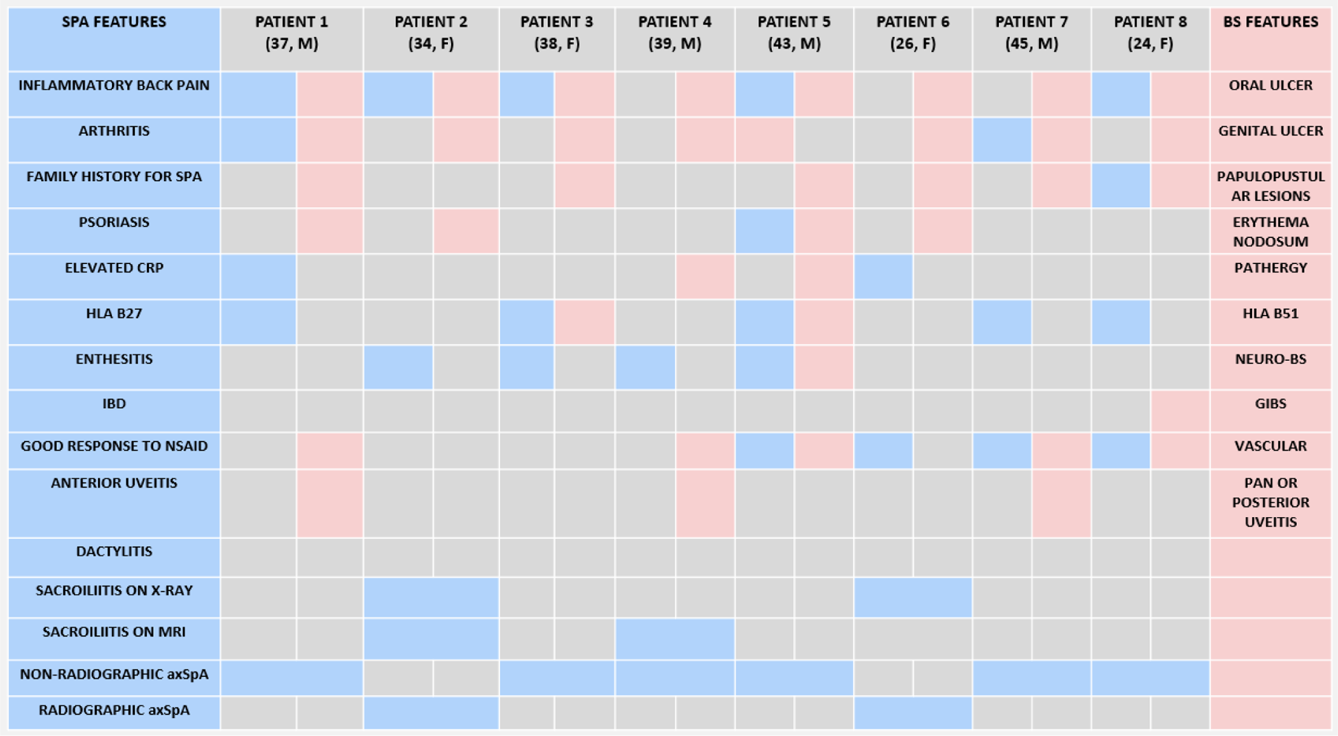 Results: Among 196 BS patients, 45 (23%) had current chronic back pain, and 24 (53%) whom reported as inflammatory. Eight patients (4%; 95% CI 1.8-8; p=0.04) fulfilled axSpA criteria according to ASAS. Two patient was classified as radiographic axSpA and the remaining 6 were classified as non-radiographic axSpA (Table 1). Among the 6 patients with non-radiographic axSpA, one patient fulfilled the imaging arm (MRI positive) while the other 5 patients fulfilled the clinical arm (HLA-B27 positive). Demographics and features of SpA and BS in these 8 patients are presented in the Figure 1. HLA-B27 was positive in 8 (4%) of the total patient population. Out of 13 BS patients with a past history of chronic back pain, only one was classified as radiographic axSpA. This patient manifested with IBP, positive findings of sacroiliitis on X-ray and MRI, arthritis, a good response to NSAID, and a positive family history.