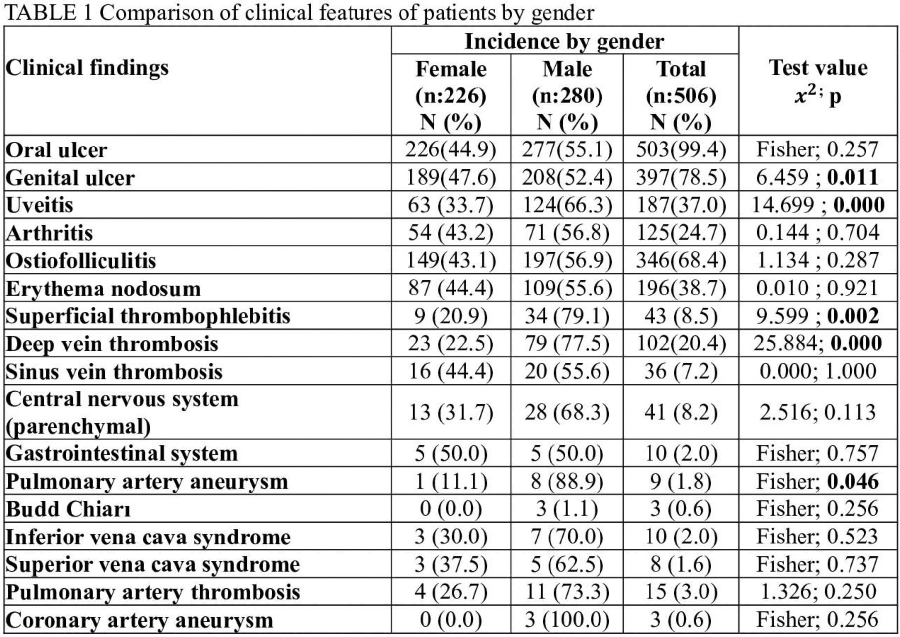Methods: According to the classification criteria of the International Study Group, 506 patients diagnosed with Behçet’s disease were included in the study. Demographic data and laboratory and clinical findings of the patients were obtained retrospectively from hospital records, and the distribution of clinical findings by gender was evaluated.