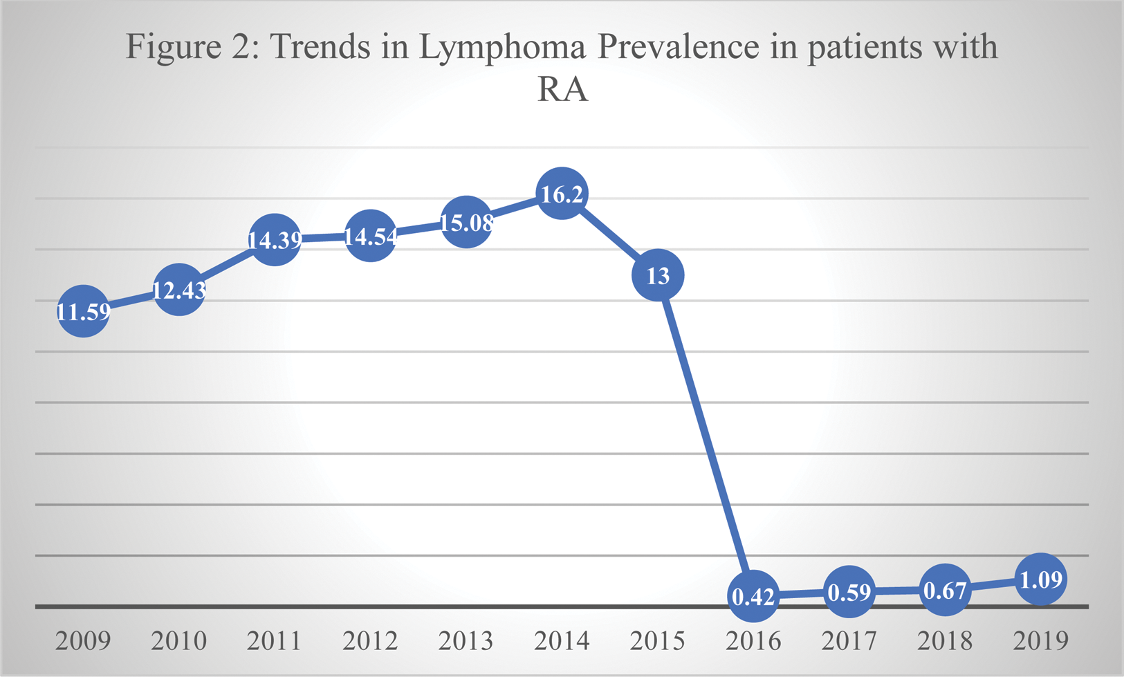 Conclusion: The prevalence of lymphoma showed a significant decline, dropping sharply from 11.59% in 2009, when the study commenced, to its lowest recorded level of 0.42% in 2016, with the peak prevalence in 2013 reaching 15.08%. This reduction in lymphoma prevalence appears to align with advancements in the therapeutic management of RA, resulting in lower disease activity and subsequently reduced lymphoma risk. Further investigations are necessary to pinpoint the specific reasons for this decline. Understanding these factors could improve patient care and alleviate the considerable economic burden, as evidenced by the approximate $17,000 cost incurred during a week-long hospital stay for these patients.