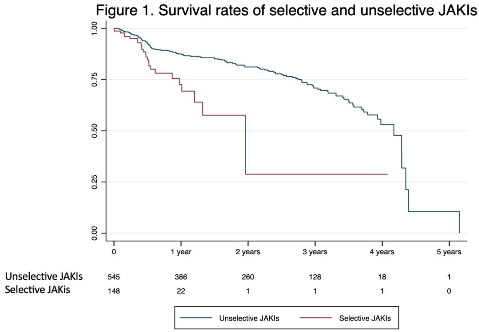 Objectives: To assess differences between selective and unselective JAKIs in terms of discontinuation’s rate.