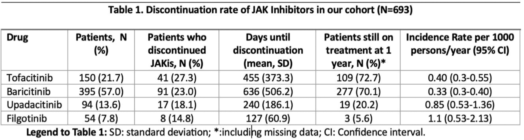 Results: 693 patients were included in study. 395 (57%) patients received baricitinib, 150 (21.7%) tofacitinib, 94 (13.6%) upadacitinib and 54 (7.8%) filgotinib. The majority of patients were treated with unselective JAKi (78.6% vs 21.4% of selective JAKi). 157 (22.7%) patients discontinued JAKI after a median time of 334 days (IQR 152-869). Details of discontinuation rates for each drug are reported in Table 1.