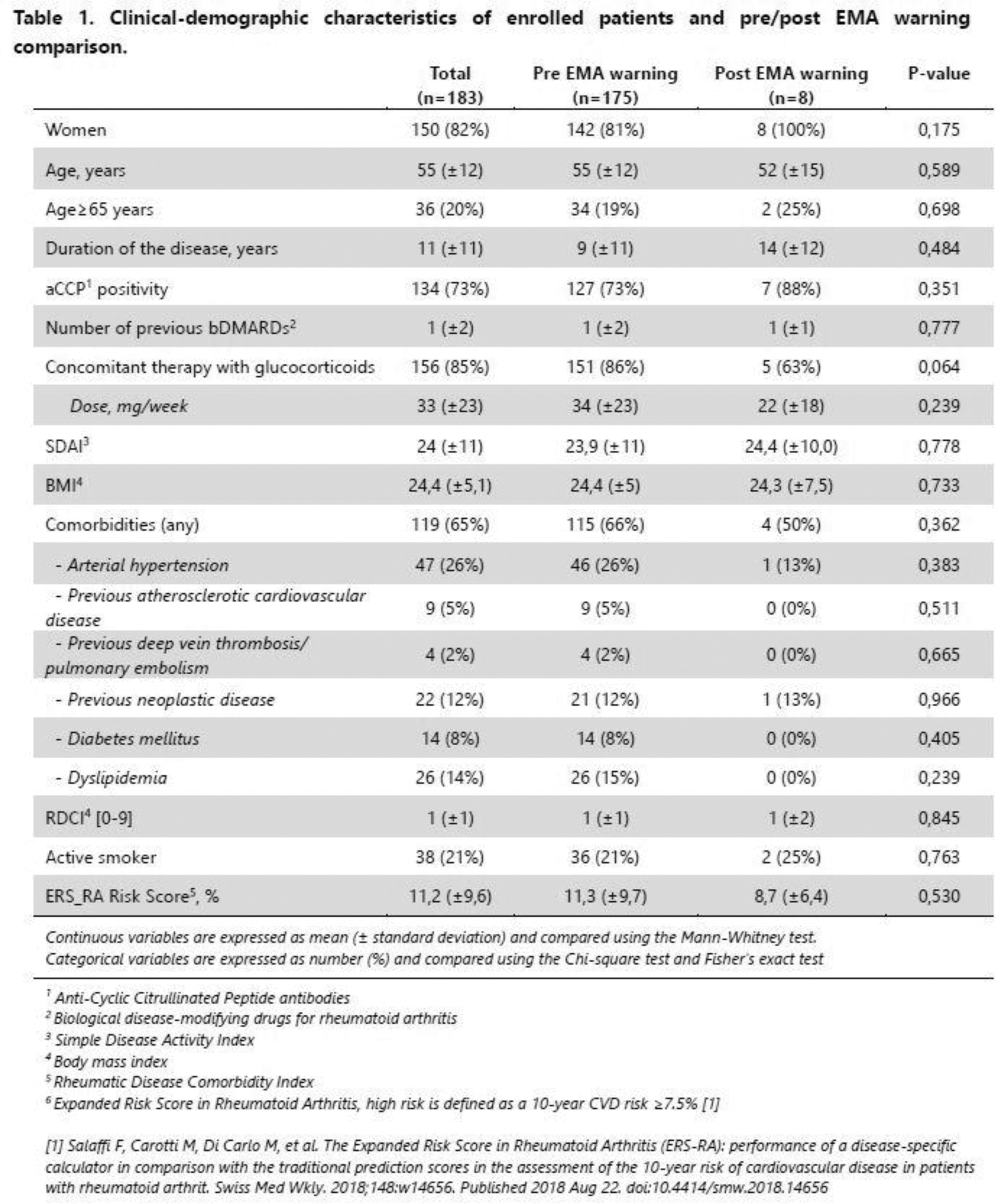 Conclusion: Our study found no significant change in patient characteristics before and after EMA recommendations, most likely due to a lack of statistical power. Despite the small sample size, our findings indicate that patients who started JAK-I after the EMA recommendations had lower cardiovascular, thromboembolic and neoplastic risk factors. However, both groups had a significant cardiovascular risk (ERS-RA>7.5%), which is presumably driven by disease activity at medication beginning.