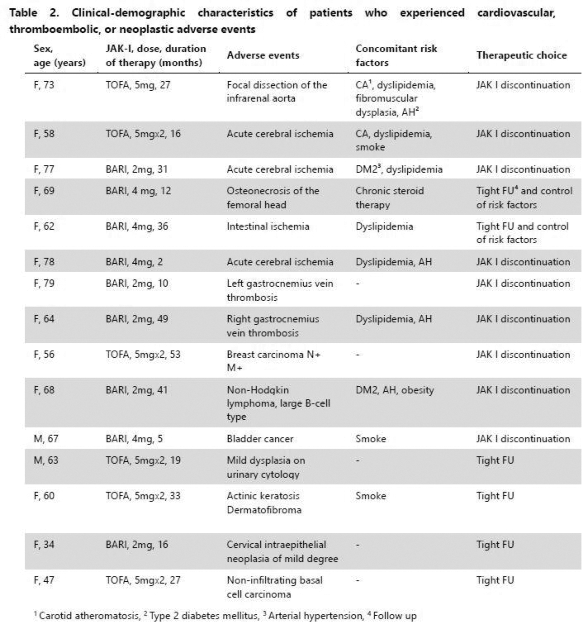Among 183 patients, 112 (60%) discontinued JAK-I therapy: 58 due to primary/secondary inefficacy, 42 due to adverse events [neoplasms (3), hepatopathy (5), venous/arterial vascular events (6), infectious events (18), others (10)], 11 due to a new risk assessment, based on EMA recommendations, and 1 due to personal decision. Fifteen individuals (8%) had adverse cardiovascular, thromboembolic, or neoplastic events, which resulted in JAK-I discontinuation in 9 patients (5%). All these subjects commenced JAK-I before the EMA recommendations. The clinical-demographic characteristics of these patients are detailed in Table 2. All the subjects who experienced cardiovascular/thromboembolic adverse events (8/183, 4%) had at least one other concurrent cardiovascular risk factor and/or were above the age of 65. During therapy, 7 patients developed a neoplastic condition; however, only 3 required tsDMARD discontinuation due to invasive/malignant features.