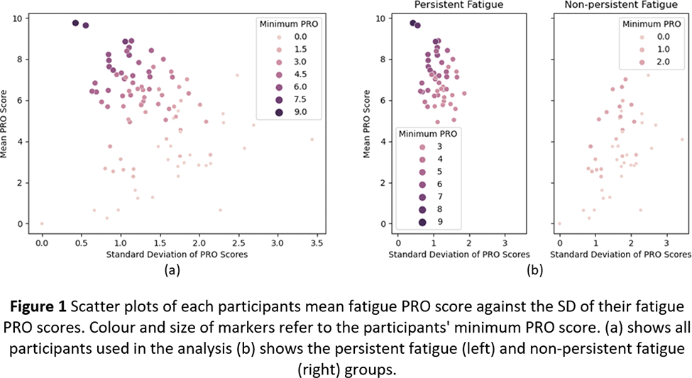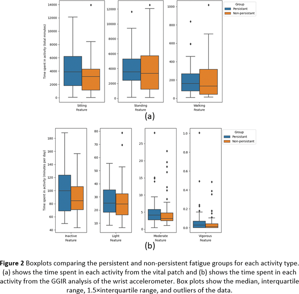 Methods: 105 participants with PSS recruited from an observational study wore an ECG-based VitalPatch sensor on the chest and a triaxial accelerometer (Actigraph GT9X Link) on the non-dominant wrist at home for two 7-day continuous periods. Concurrently, the participants completed paper-based PROs relating to fatigue up to 4 times a day: morning, afternoon, evening, and night (however night was not included in this analysis) with 0 meaning no fatigue and 10 meaning maximum fatigue. The participants were labelled as presenting with “persistent fatigue” if their minimum fatigue rating across the study was 3 out of 10 or higher and as “non-persistent fatigue” if it was 2 or lower. This separated the participants into those with consistently high ratings of fatigue and those with more variable ratings of fatigue, as seen in Figure 1. The time each participant spent in activity types (standing, walking, or sitting behaviours) were estimated by the VitalPatch sensor’s built-in software [3,4] and the time spent in activity intensity levels (inactive, light, moderate, and vigorous) were estimated from the wrist-worn accelerometer using GGIR [5,6,7]. The boxplots of the digital measures extracted from each group are shown in Figure 2, and the Mann-Whitney U test was used to assess if the distributions of the two groups differed significantly.