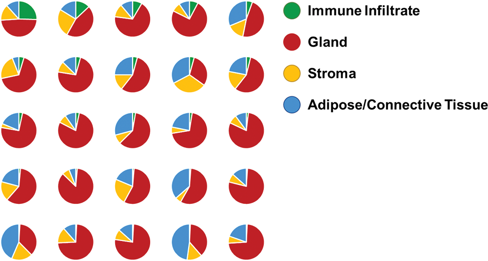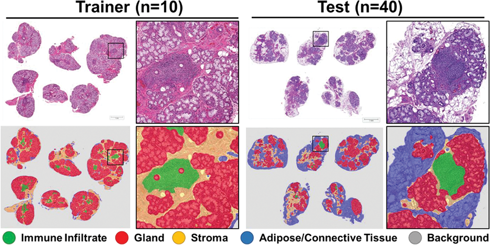 Results: The algorithm accurately identifies all 5 classes across varying degrees of disease severity across SJD patients and controls, as well as differences in staining intensity. Though inaccuracies are observed, the overall results were better than previous machine-learning methodologies (data not shown/published) and were quickly applied to samples (approximately 30sec of analysis time per sample). Resulting data show a high degree in variability in percent immune infiltration and gland.