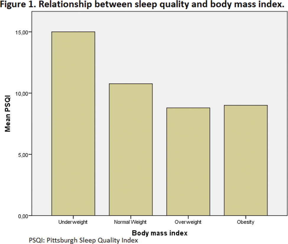 Results: The mean age of the 117 PSS patients was 55.2±11.7 years and the mean disease score (ESSDAI) was calculated as 4.4±5.0. Although not significant, there was an association between BMI and sleep quality (p=0.186). Regression analysis showed a significant relationship between lean mass and PSQI sleep scores (r:-0.201, p:0.043). The sleep quality of overweight people seems to be relatively better (Figure 1). Specifically, patients with more lean mass than fat mass slept better. While 55.6% of the patients were inactive, 44.5% performed minimal or vigorous exercise. Exercise did not improve sleep quality (p=0.35). On the contrary, the rate of poor sleep was higher among who exercised (p=0.192). The rate of patients with poor sleep quality was 75.5% in all patients, and the rate of sleep disturbance was 83% in those who did any exercise. In addition, physical function was found to be lower in patients with higher physical activity compared with the minimal and low physical activity groups, although not significantly (p=0.061). The ESSDAI scores of the very active patients were higher than those of the minimally active or inactive patients, although not significantly (p=0.153), whereas the fatigue scores of the vigorous exercisers were better (0.360). Depressed patients had significantly worse physical functioning (p=0.016). However, although not significant, the mean depression scores of those who exercised were lower (p=0.156). In addition, the mental health of those who were vigorously active was better (p=0.169) (Table 1).