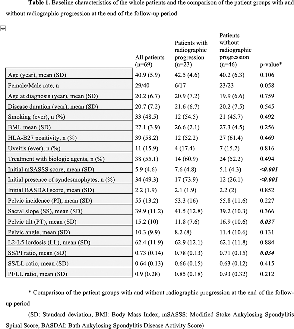 Results: Sixty-nine patients completed the prospective follow-up period, with a median (IQR 25-75) follow-up period of 47.7 (34.6-52.8) months. Of these patients, 40 (58%) were male, and 39/68 (58.2%) were HLA*B27 positive, 38 (55.1%) were under treatment with biological therapies during the follow-up period. Radiographic progression developed in 23 (33.3%) of 69 patients. The mean (SD) mSASSS and the mean (SD) the number of syndesmophytes of these patients, respectively: at the time of enrolment were: 8.5 (4.6), 2.1 (1.8); after two years of follow-up were: 11.1 (4.28), 2.6 (1.9); at the end of the study were: 14.5 (4.7), 5 (2.7). Patients with radiographic progression statistically significantly had a higher baseline mSASSS (p<0.001), syndesmophyte count (p<0.001), PT measurement (p=0.037), and SS/PI (p=0.034) ratio than those without. No statistically significant difference existed between those with and without radiographic progression in gender, smoking, BMI, HLA*B27 positivity, and receiving biological treatment rates (Table 1). When PI, SS, and LL, were compared, PI was lower, and SS was higher in those with radiographic progression than those without. However, the difference between both parameters did not reach statistical significance. Nevertheless, the SS/PI ratio was statistically significantly higher in those with radiographic progression (in groups with and without radiographic progression, respectively; mean (SD): 0.78 (0.13) and 0.71 (0.15); p=0.034). Multivariate logistic regression analysis revealed that SS with an OR of 1.14 (95%CI: 1-1.31 p=0.043) and PI with an OR of 0.9 (95%CI: 0.82-0.996, p=0.041) were significant risk factors that are independent of the effects of previously reported risk factors or new bone formation.