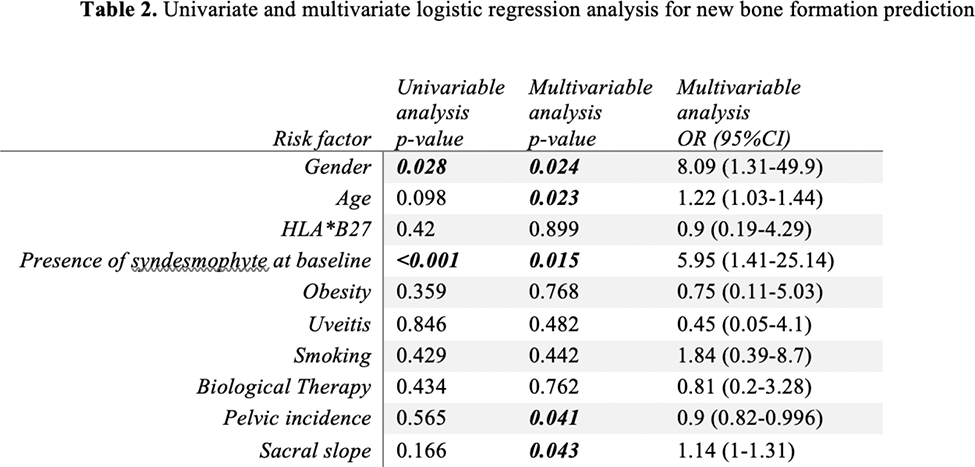 Conclusion: The SS/PI ratio is significantly higher in patients with radiographic progression. The baseline SS/PI ratio is correlated with the progression of mSASSS per unit time under follow-up, and the PI itself has a negative correlation with the progression in the lumbar spine. These correlations are more emphasized in the male sex and increase with age. In this model of new bone formation, information on HLA*B27, obesity, uveitis, smoking, and treatment had no additional contribution.