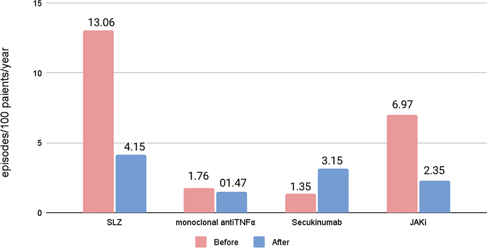Results: Uveitis was observed in 50 patients (21 women/29 men) out of 309 (16.2%) and ocular surface pathology in 8 (2.7%). Demographic and clinical features in patients who developed ocular pathology and specifically uveitis and those who did not are summarized in Table 1. Uveitis was acute in all cases, anterior (98%), unilateral (72%), unilateral alternate (28%) and recurrent (70%). Ocular surface pathology was episcleritis (75%), scleritis (12.5%) and corneal ulcer (12.5%). Patients with uveitis had a greater frequency of positive HLA-B27 (88% p<0.001) and severe sacroilitis (56% p=0.03) than patients without uveitis. Activity indexes (BASDAI, ASDAS) were similar regardless ocular involvement. Biological DMARDs were used in 24 (48%) patients with uveitis; 22(44%) of them received anti-TNFα monoclonal antibodies, etanercept (ETN) 4 (2%), secukinumab (SECU) 12 (24%) and JAK inhibitors (JAKi) 7 (14%). The EAIR of uveitis before treatment with sulfasalazine (SLZ) was 13.06 episodes/100 patients-year, with monoclonal anti-TNFα developed 1.76 episodes/100 patients-year, with SECU 1.35 episodes/100 patients/year and with JAKi 6.97 episodes/100 patients/year. After treatment, patients treated with SLZ, monoclonal anti-TNFα and JAKi developed 4.15, 1.47 and 2.35 episodes/100 patients/years, respectively, while in those treated with SECU was 3.15 episodes/100 patients/year.