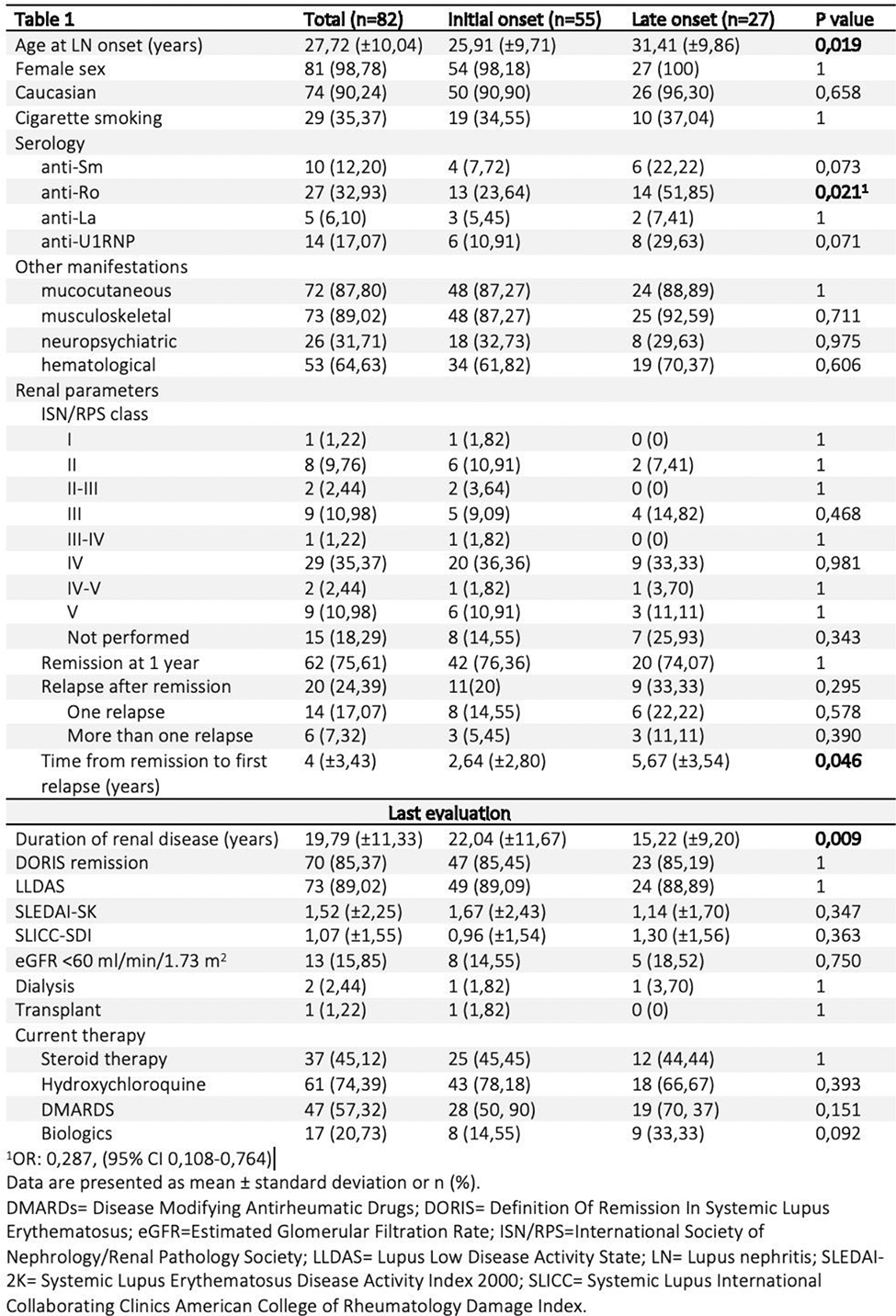 Methods: The study involved 243 patients diagnosed with SLE between 1970 and 2019 at our Lupus Clinic. Patients with renal involvement were categorized into two groups: “initial onset”, with renal issues at the disease’s start, and “late onset” developing renal involvement later. Demographic, laboratory, histological, and therapeutic data were collected for both groups. Categorical variables were reported as proportion and/or percentage, continuous variables were expressed as mean (±standard deviation) values. Continuous variables were compared using one-way Anova or Mann-Whitney test, categorical variables with Chi-Squared or Fisher’s exact test. P values <0.05 were considered statistically significant.